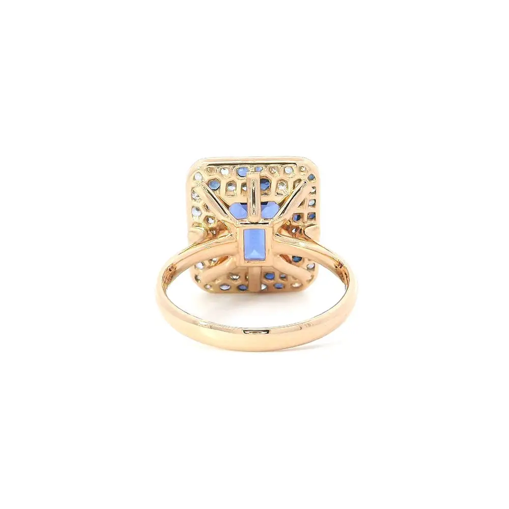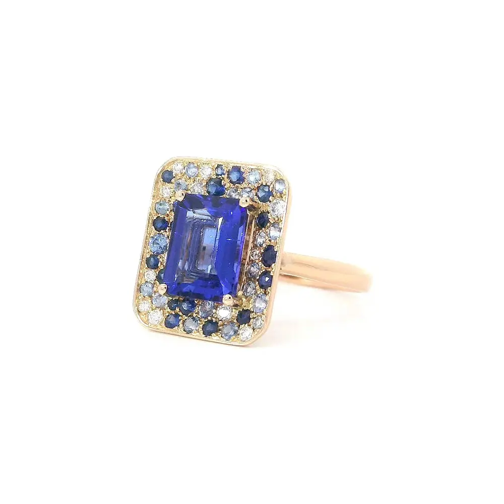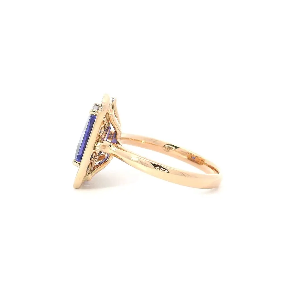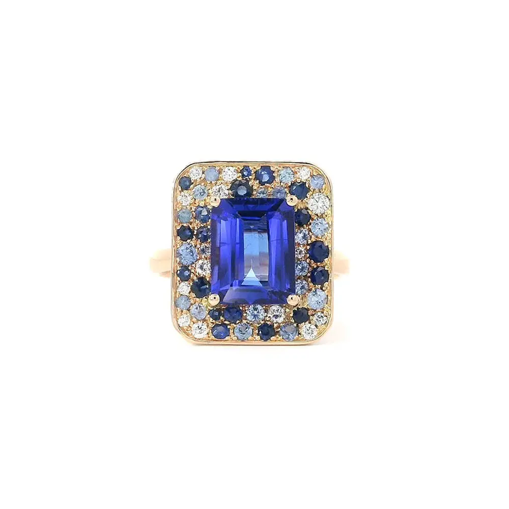 这款独特的18K 玫瑰金戒指是优雅、奢华和珍贵宝石的完美结合。戒指上的主石是一颗长方形的蓝色坦桑石,重 2.71 克拉,其迷人的色调会让所有喜爱非凡珠宝的人为之着迷。