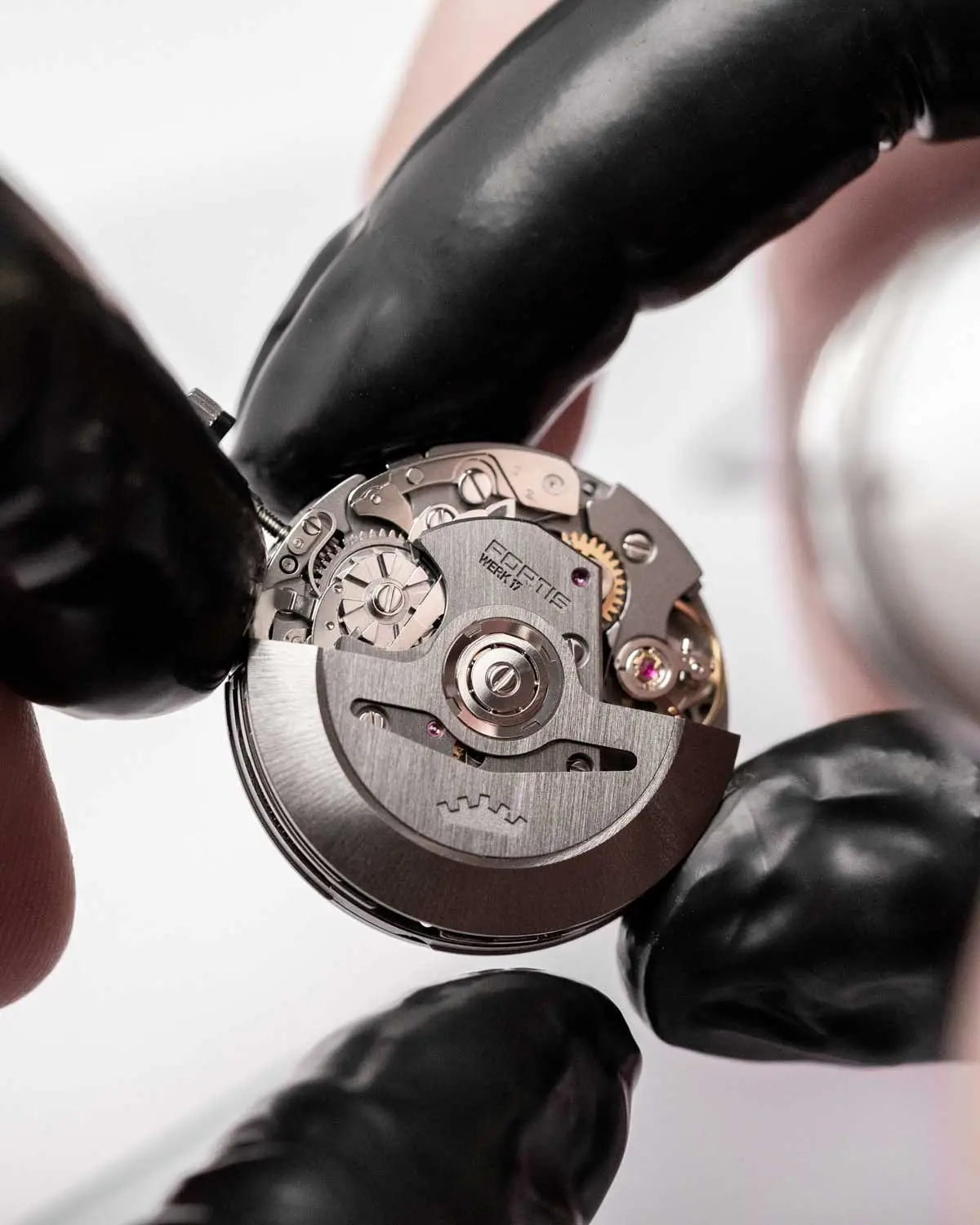 内部搭载自制机芯 Fortis Werk 17,配备 导柱轮计时结构 与 60 小时动力储存,精准可靠。配以可微调的不锈钢 Block Bracelet 链带,兼具舒适与力量感。