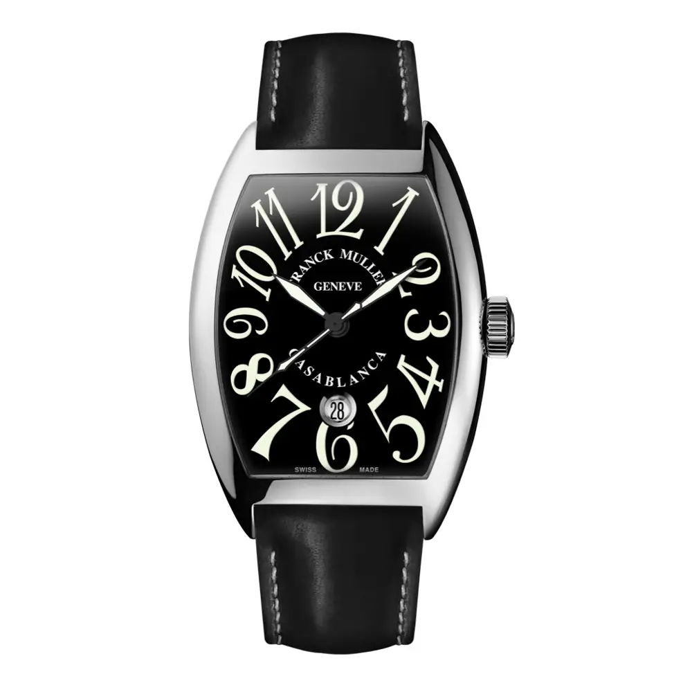 Casablanca 是 Franck Muller 最具魅力的经典系列之一 —— 融合优雅从容、Art Deco 风格与独特的“电影感”与旅行都市气质。黑色哑光表盘 配以标志性字体,读时清晰,而 6点位日期显示 自然融入布局之中。