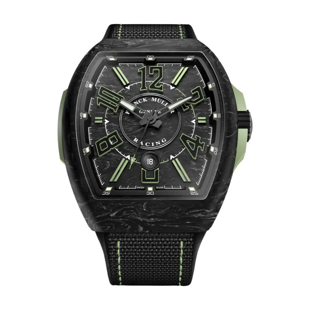 Franck Muller Krypton Racing 凭借其前卫而大胆的设计脱颖而出,融合了航空级碳纤维与内嵌的 Super-LumiNova 夜光技术。这些夜光粒子被直接注入 表壳与表盘,在黑暗中呈现出迷人的星系般光效。表壳尺寸为 44 × 53.7 毫米,由 150 层碳纤维压制而成,坚固又轻盈。