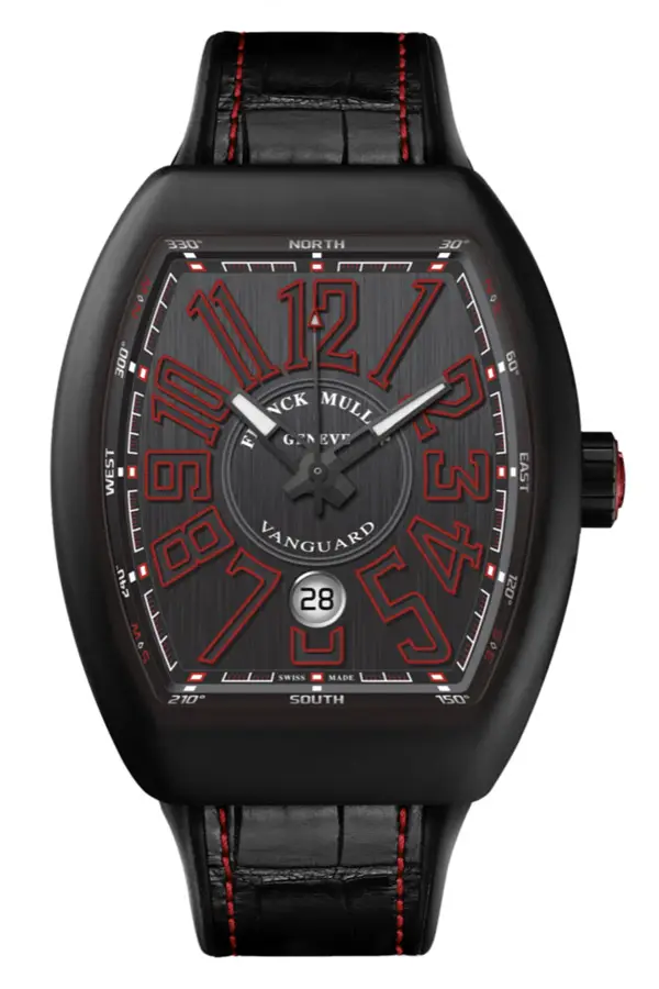 大号数字、独特指针、运动型橡胶或织物表带以及镂空表盘等设计元素赋予了 Vanguard 系列独特而现代的外观。腕表通常包括计时码表、陀飞轮或自动日历 机芯等复杂功能,全部由Franck Muller自制的机械机芯驱动。