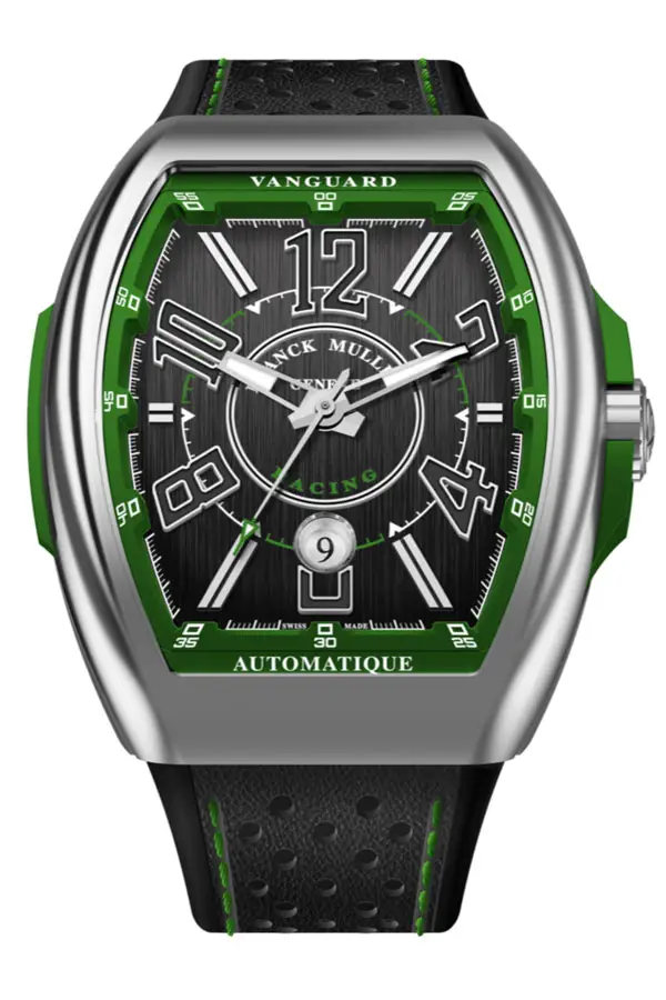 大号数字、独特指针、运动型橡胶或织物表带以及镂空表盘等设计元素赋予了 Vanguard 系列独特而现代的外观。腕表通常包括计时码表、陀飞轮或自动日历 机芯等复杂功能,全部由Franck Muller自制的机械机芯驱动。