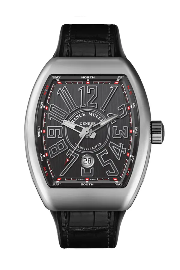 大号数字、独特指针、运动型橡胶或织物表带以及镂空表盘等设计元素赋予了 Vanguard 系列独特而现代的外观。腕表通常包括计时码表、陀飞轮或自动日历 机芯等复杂功能,全部由Franck Muller自制的机械机芯驱动。