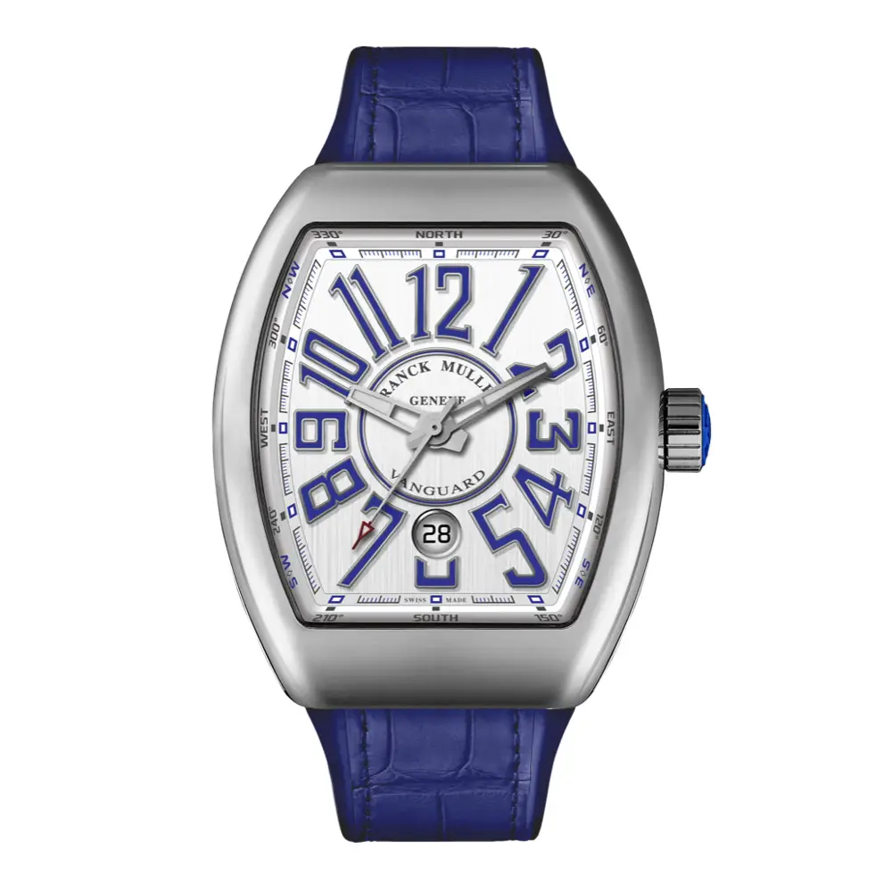 Vanguard V 45 SC DT (BU) 以运动与优雅融合的方式诠释 Franck Muller 标志性的酒桶形设计。银色 太阳放射状机刻纹表盘 搭配 蓝色立体数字刻度,呈现清爽而富有活力的现代风格,并与 蓝色鳄鱼皮表带 形成协调统一的视觉效果。