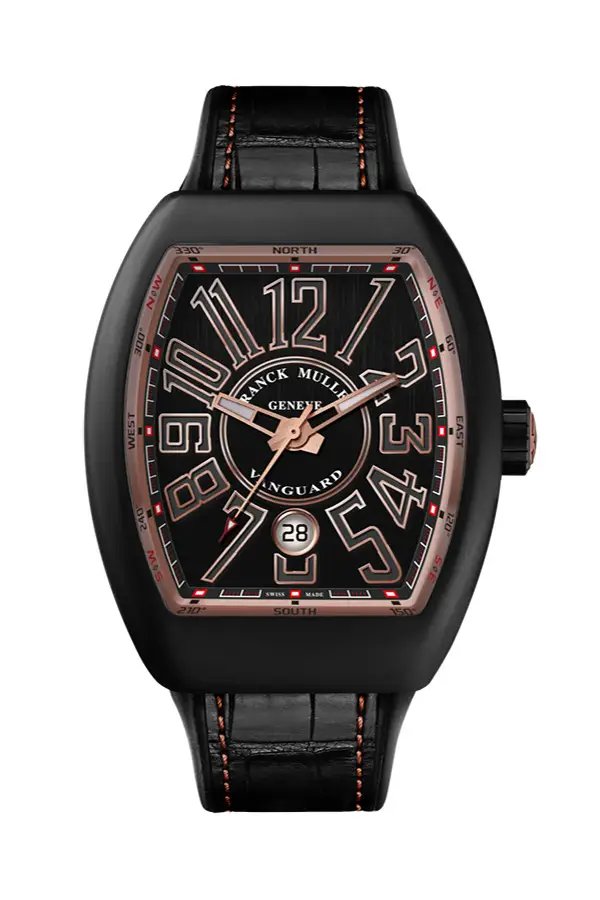 大号数字、独特指针、运动型橡胶或织物表带以及镂空表盘等设计元素赋予了 Vanguard 系列独特而现代的外观。腕表通常包括计时码表、陀飞轮或自动日历 机芯等复杂功能,全部由Franck Muller自制的机械机芯驱动。