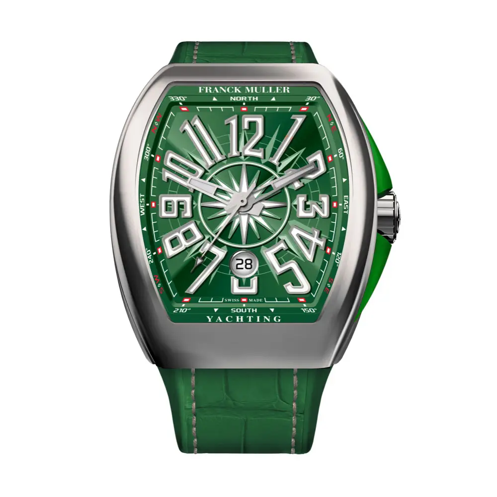 Franck Muller Vanguard Yachting V43 SC DT YACHT (VR) 以现代运动风格展现航海精神。醒目的绿色表盘搭配罗盘玫瑰图案和夜光刻度,视觉效果出众。搭配深绿色表带和侧边装饰,整体色彩和谐,令人联想到大海与自由。