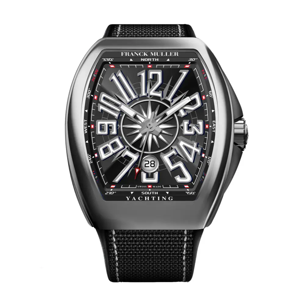 大号数字、独特指针、运动型橡胶或织物表带以及镂空表盘等设计元素赋予了 Vanguard 系列独特而现代的外观。腕表通常包括计时码表、陀飞轮或自动日历 机芯等复杂功能,全部由Franck Muller自制的机械机芯驱动。