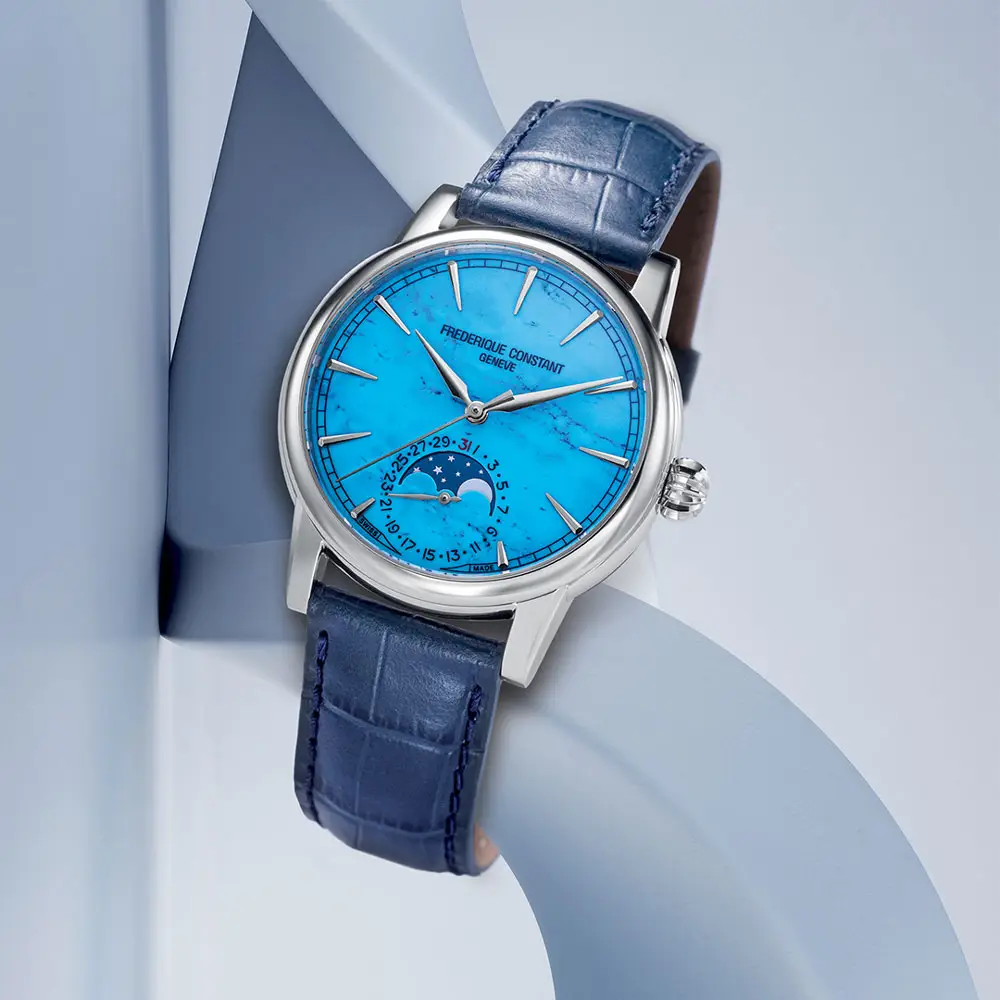 Frederique Constant Manufacture Classic Moonphase Date 代表了瑞士高级制表工艺的巅峰之作,充分展现了精湛工艺与非凡材质的完美结合。40 毫米不锈钢表壳比例优雅,而 天然绿松石表盘 拥有独一无二的纹理,使每一枚腕表都成为不可复制的艺术品。全球限量 716 枚,彰显其卓越的收藏价值。