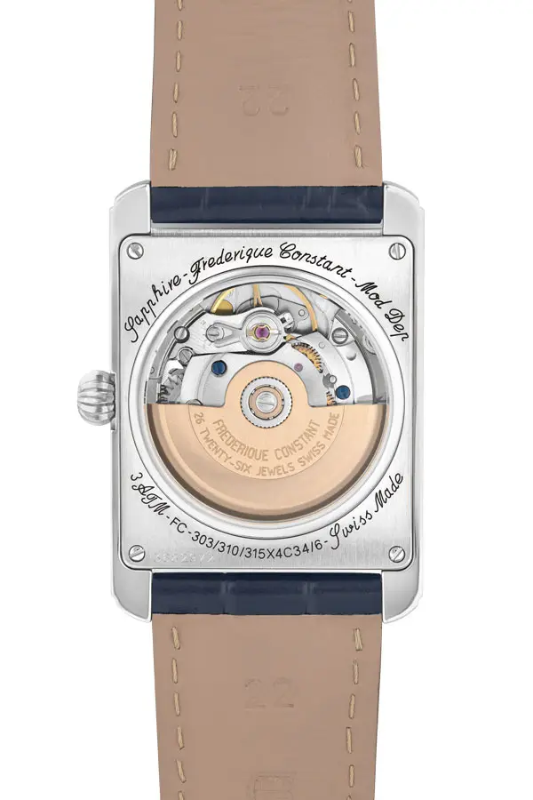 手表由具有自动上链功能的机械机芯驱动。这种机芯不仅精确,而且为用户提供了便利,因为无需手动上弦。FC-303机芯提供约38小时的动力储存,振频为每小时28,800次(4赫兹)。由于26颗宝石的支撑,机芯非常精确可靠。
