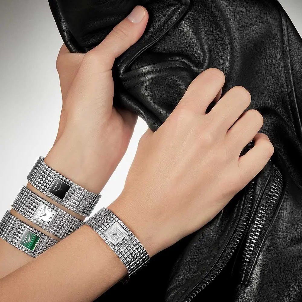 表壳与一体式表链采用 不锈钢打造,并饰以 Clou de Paris 纹理,赋予腕表奢华质感。黑色缟玛瑙表盘 形成鲜明对比,凸显极简美学设计。蓝宝石水晶玻璃 为表盘提供出色的耐刮保护。