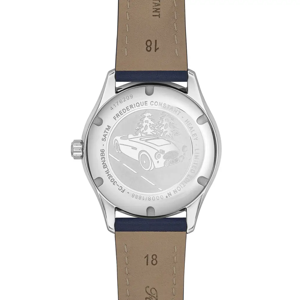 Frederique Constant Vintage Rally Healey Automatic Limited Edition 将经典制表美学与传奇汽车文化完美融合。36 毫米不锈钢表壳搭配 蓝色太阳纹表盘,灵感源自 Austin-Healey 3000 MKII 的标志性色调,红色秒针则为整体增添动感气息。全球仅限量 1,888 枚,赋予腕表极高的收藏价值。