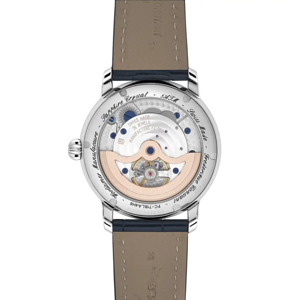 腕表搭载自制自动机芯 FC-718,动力储存约38小时,所有功能均可通过单一表冠调节。42毫米精钢表壳、带防反射涂层的蓝宝石玻璃以及鳄鱼皮表带配折叠表扣共同呈现出精致且奢华的风格,适合旅行及正式场合佩戴。