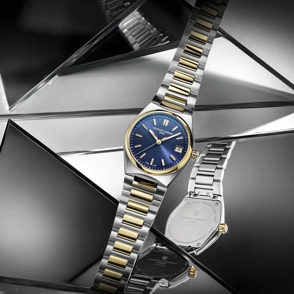 Frederique Constant Highlife Ladies Quartz 女士腕表以现代视角诠释运动优雅风格。标志性的 双色 PVD 不锈钢一体式表壳 与表链自然衔接,搭配 深蓝色太阳纹表盘,呈现出精致而富有表现力的视觉效果。