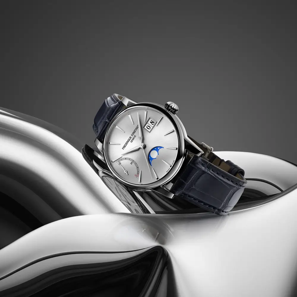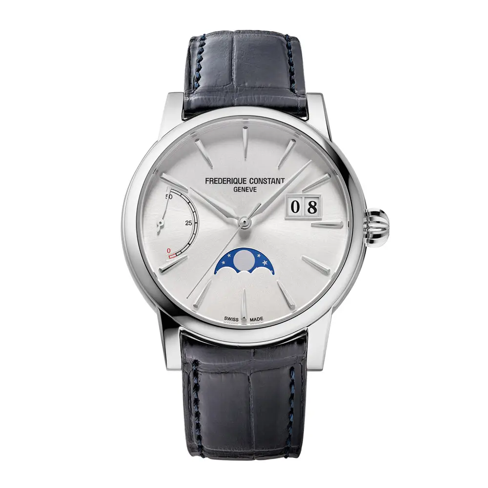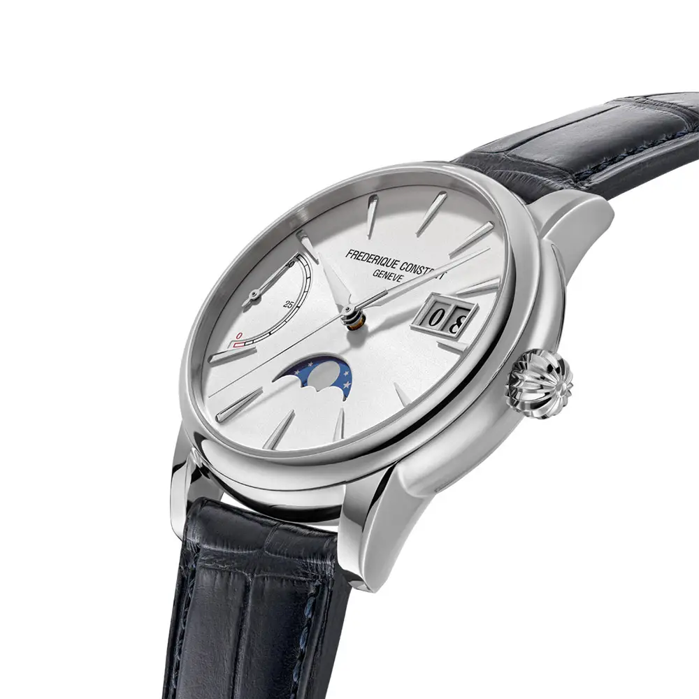 Frederique Constant FC-735S3H6 是一款卓越的机械腕表,将经典优雅与复杂功能完美结合,适合真正热爱瑞士制表艺术的用户。40 毫米精钢表壳搭配银色表盘,大日历、动力储存显示和月相功能布局均衡,呈现精致永恒的视觉效果。