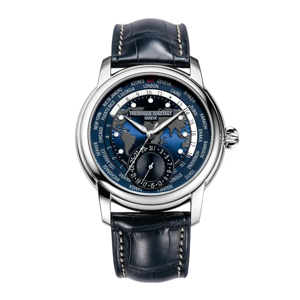 这款 Frederique Constant Worldtimer Manufacture 世界时腕表 诠释了 瑞士制表工艺与现代优雅旅行精神的完美结合。42 毫米 不锈钢表壳 搭配 蓝色地球地图表盘 与 蓝宝石水晶镜面,展现精致典雅的全球视野。