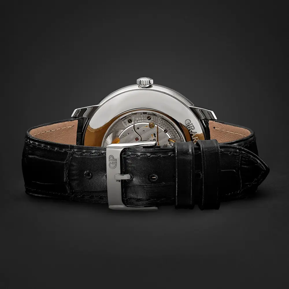 腕表内部搭载精准的 机械自动上链机芯,确保可靠和精准的运行。搭配 经典黑色鳄鱼皮表带与传统针扣,佩戴舒适并安全固定于手腕。