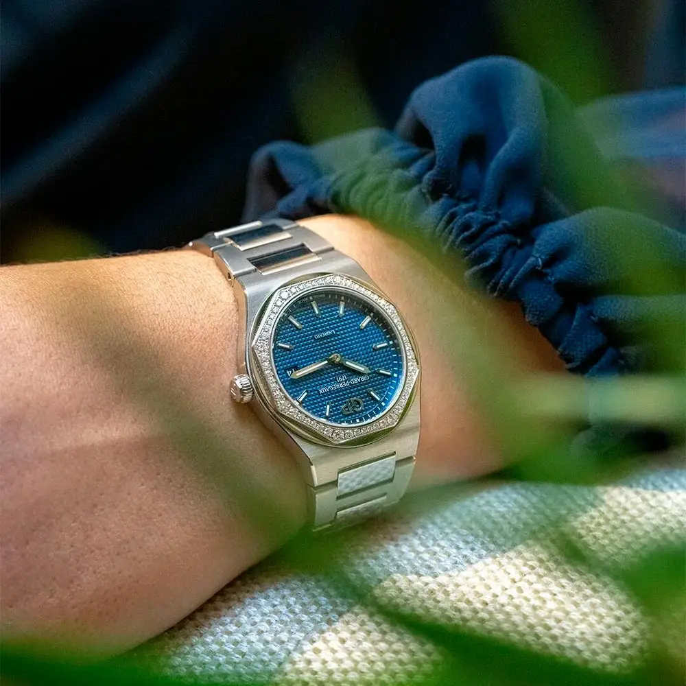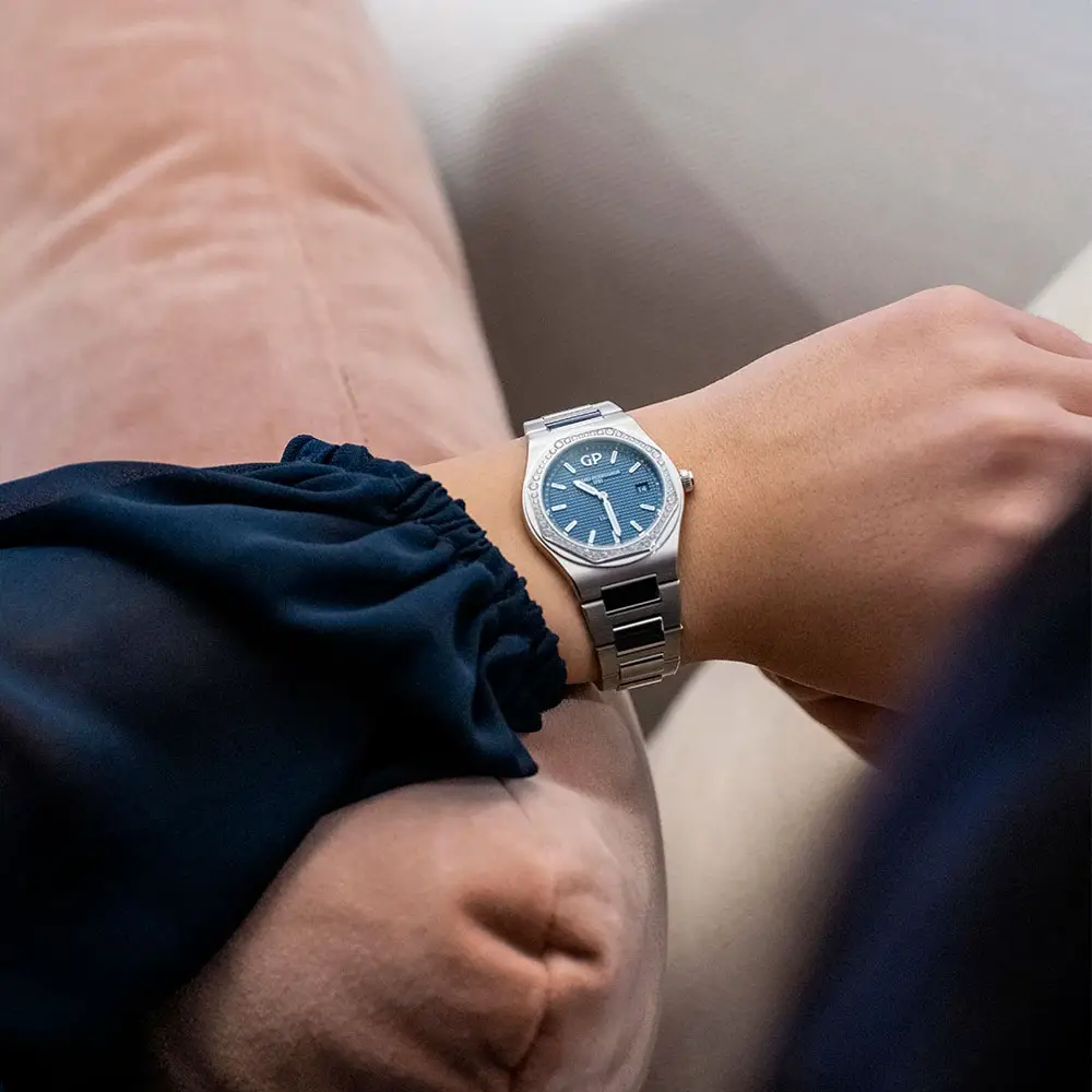 Girard-Perregaux Laureato 腕表融合了现代风格与瑞士精密工艺。直径34毫米的圆形表壳采用精钢制成,搭配镶钻精钢表圈,增添奢华光彩。
