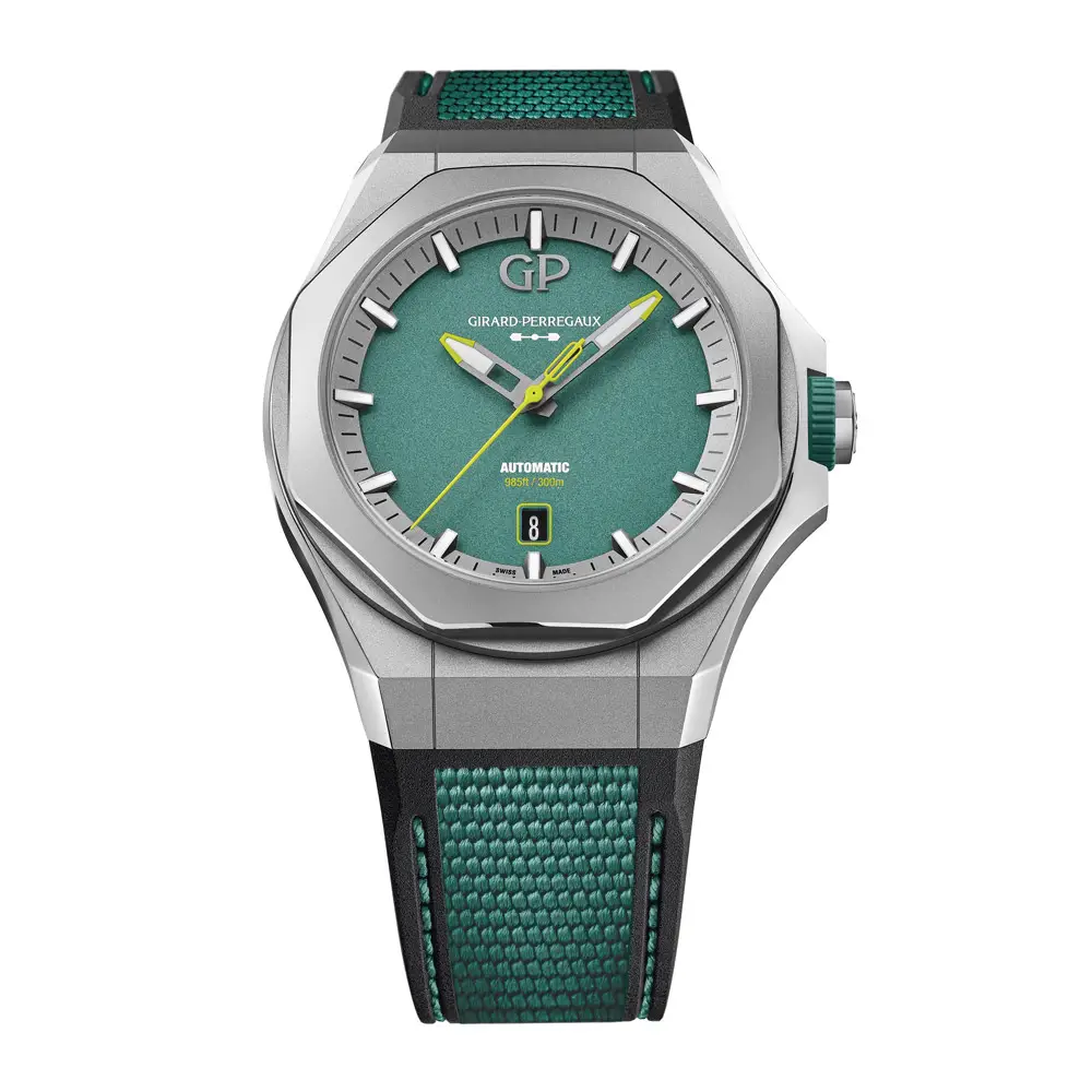 腕表搭载 自动上链机芯 GP03300-1060,振频 28,800 次/小时,具备 46 小时动力储存,精准可靠。配备 绿色橡胶表带(织物纹理) 与 钛金属可微调折叠扣。Laureato Absolute Aston Martin F1® Edition 是集 奢华、性能与赛车精神 于一体的杰作。