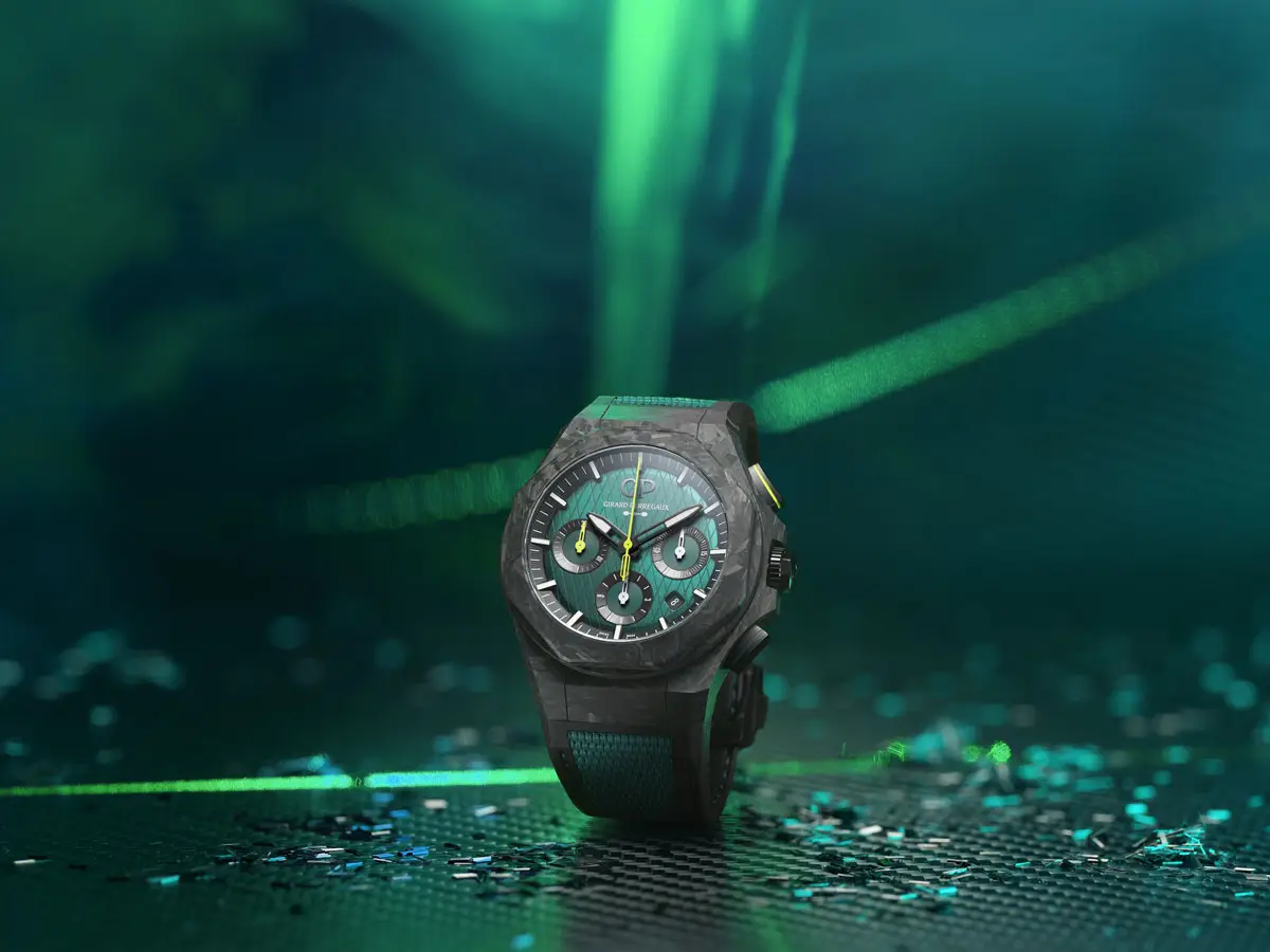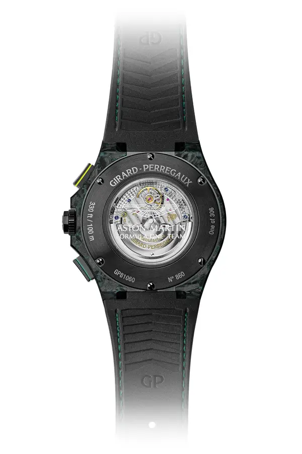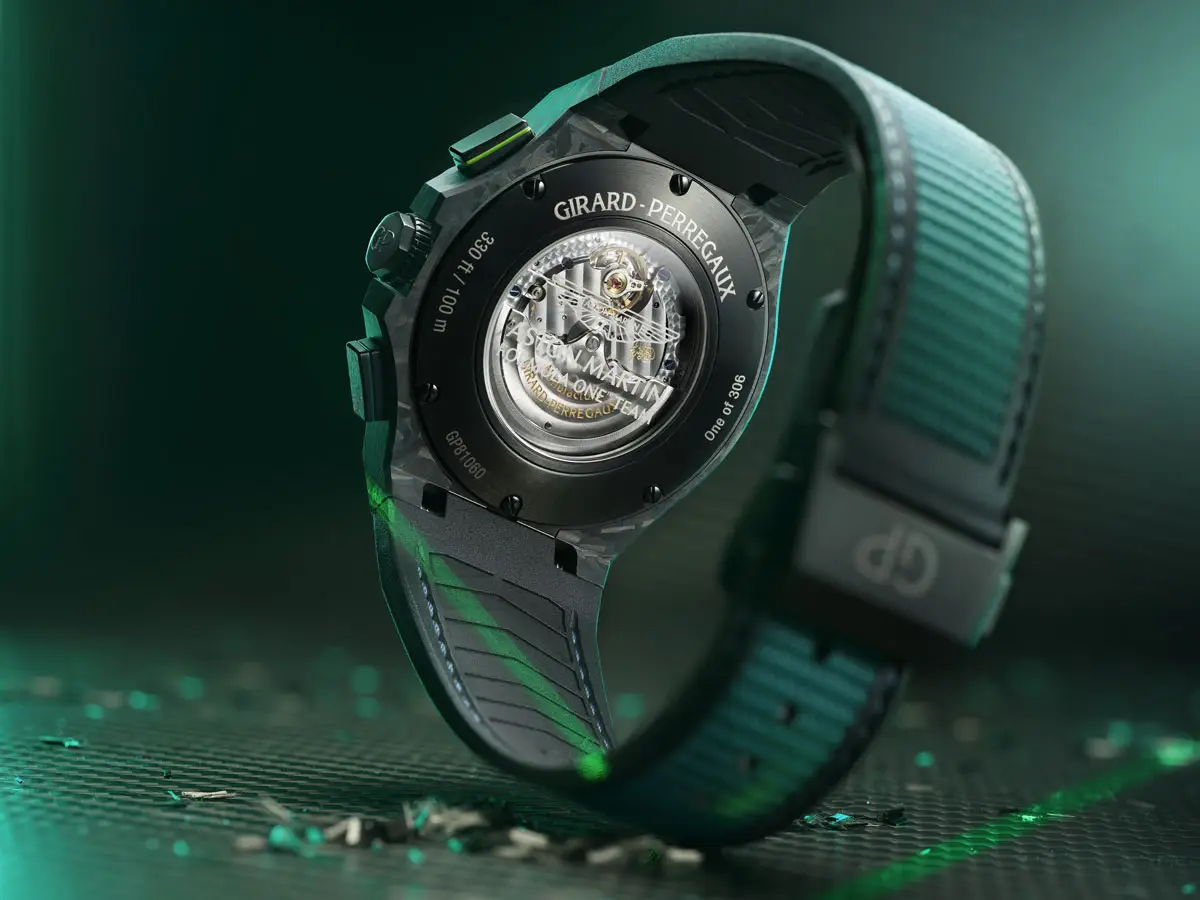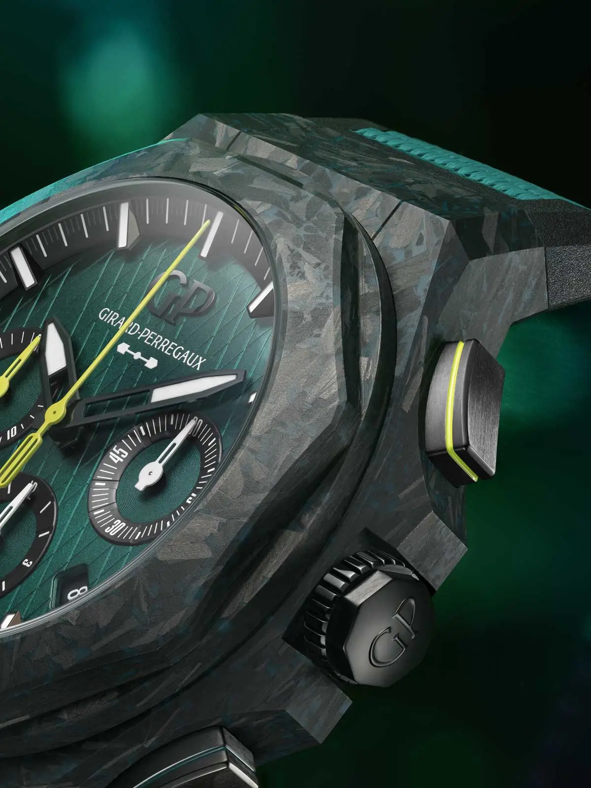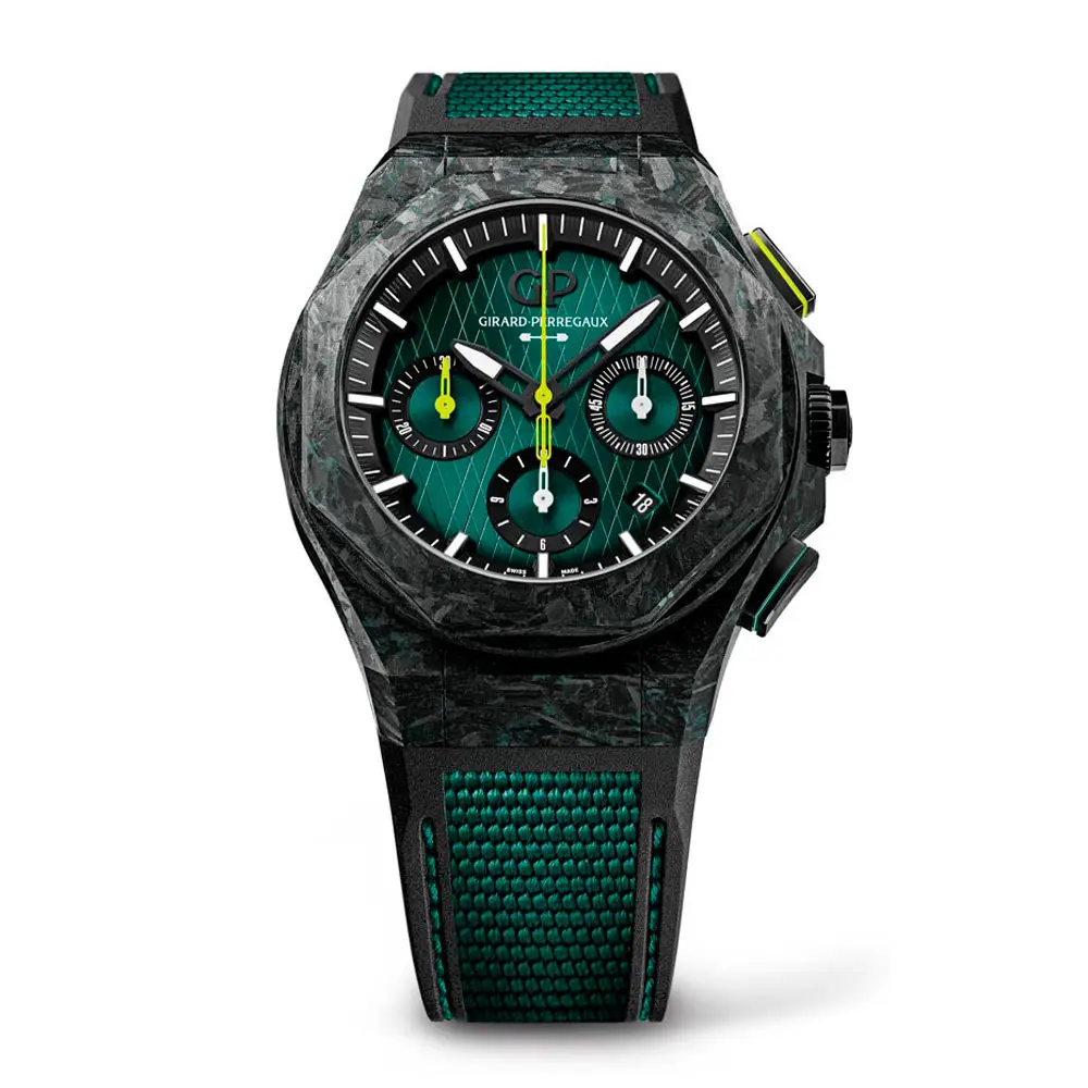 Girard-Perregaux Laureato Absolute Chronograph Aston Martin F1 Edition 将 瑞士制表工艺与一级方程式赛车精神 融为一体,限量发行 306 枚。其 44 毫米钛金属碳纤维表壳 含有来自 2021 赛季 Aston Martin F1 赛车的碳纤维,象征技术独特性与运动魅力。