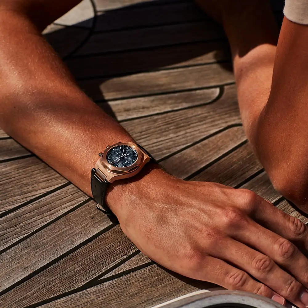 Girard-Perregaux Laureato Chronograph 42 mm 腕表以奢华材质与运动功能的优雅结合而令人瞩目。直径42毫米的圆形表壳采用尊贵的18K玫瑰金打造,精致的表圈亦采用相同材质,赋予腕表卓越且精致的外观。