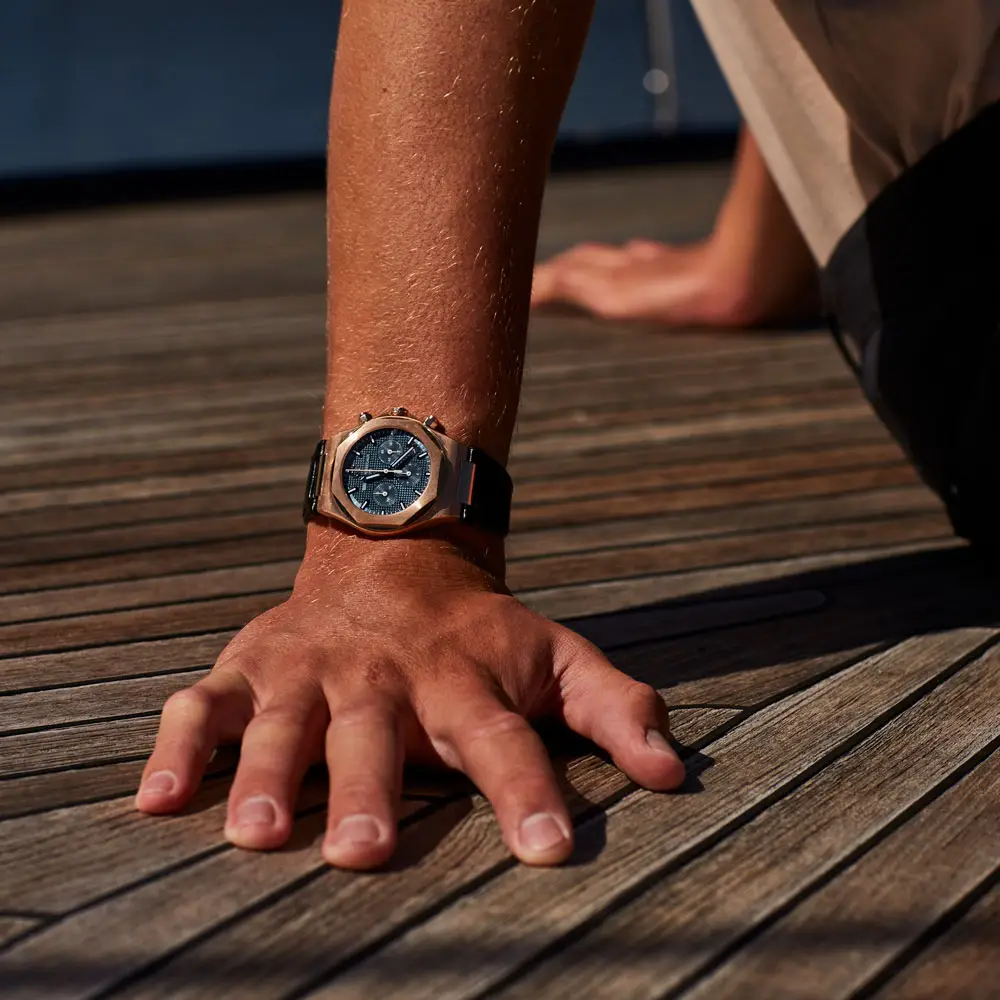 动感且优雅的设计更通过 蓝色鳄鱼皮表带与舒适折叠扣得以完善,佩戴安全且舒适。腕表 防水等级5 ATM(50米),适合日常佩戴,包括轻微接触水。