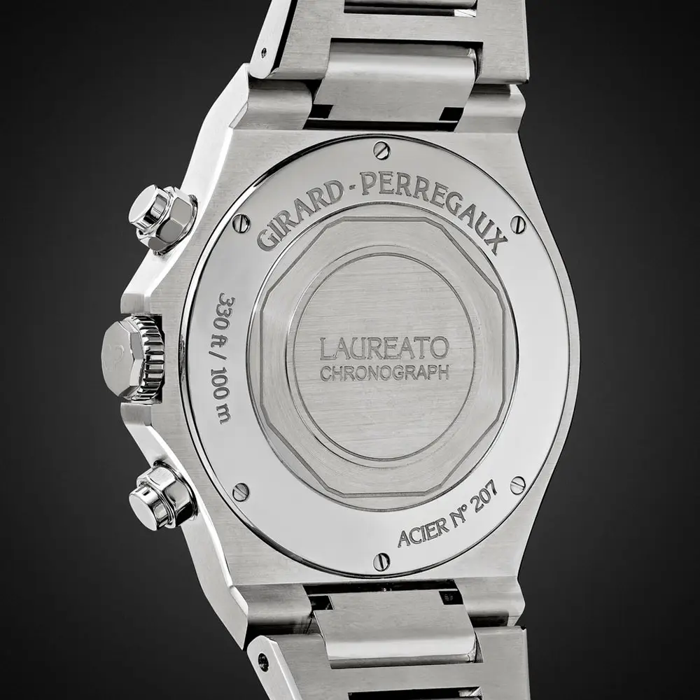 腕表搭载 自制自动机芯 GP03300-0137,拥有 46 小时动力储存,确保精准与稳定。具备 100 米(10 ATM)防水性能,Laureato Chronograph 42 mm 诠释了 力量、格调与瑞士制表艺术 的完美融合。