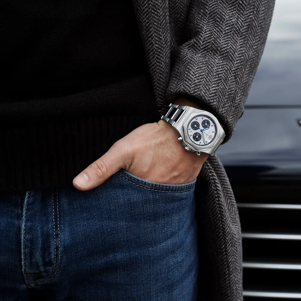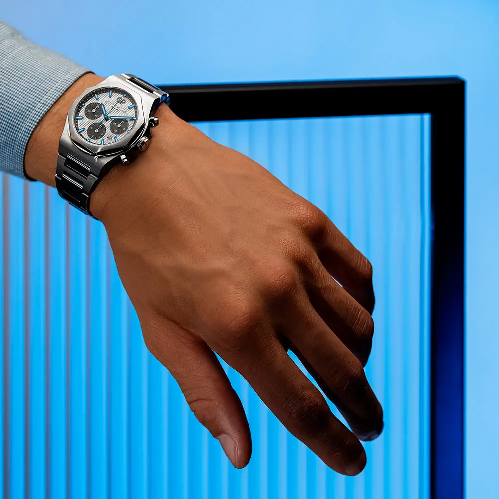42 毫米精钢表壳 搭配标志性 八角形表圈 与 一体式精钢表链,兼顾舒适与时尚。银色“Clous de Paris”表盘 采用经典熊猫布局,配备 计时功能、小秒针与日期显示。防反光蓝宝石水晶镜面 提供出色的保护与清晰度。