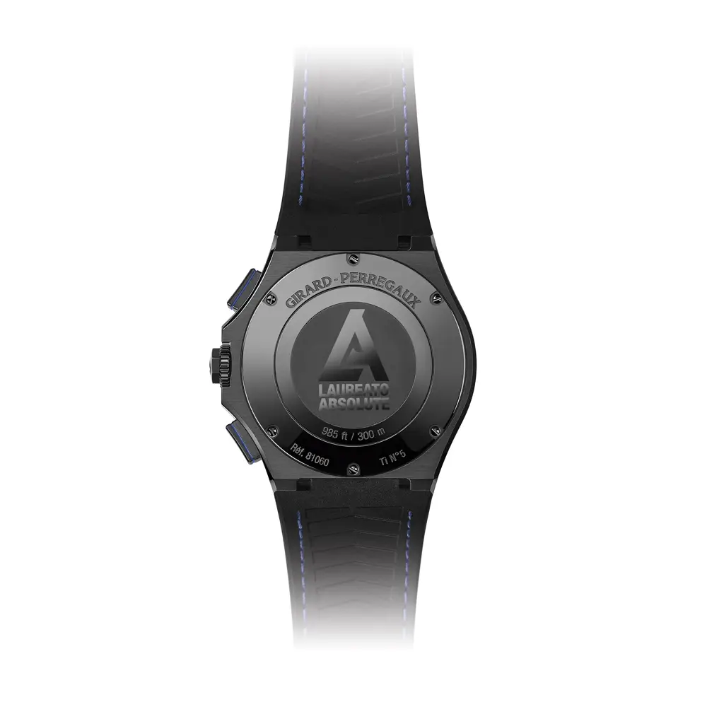 Girard-Perregaux Laureato Chronograph 81060 腕表是一款运动风格型号,结合大胆设计、顶级材质与瑞士精准工艺。直径44毫米的圆形表壳采用轻盈坚固的钛金属,即使尺寸较大也佩戴舒适,搭配 优雅的钛金属表圈。