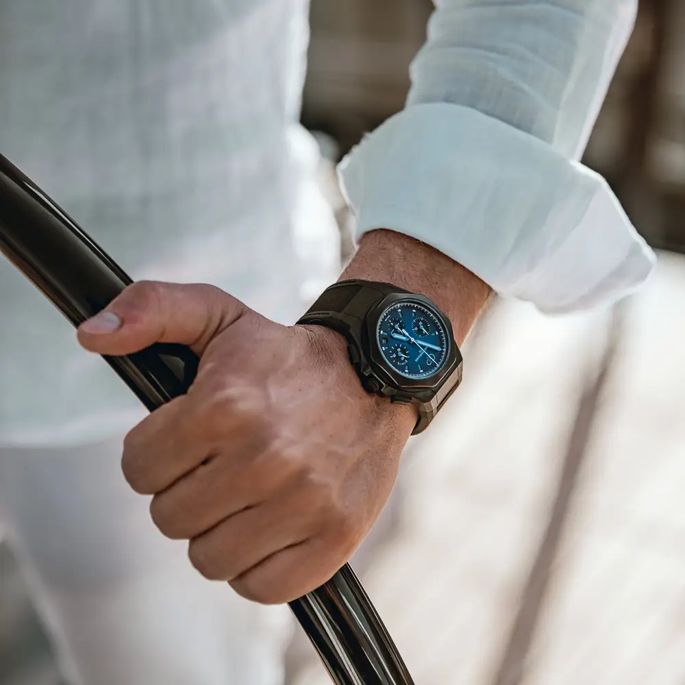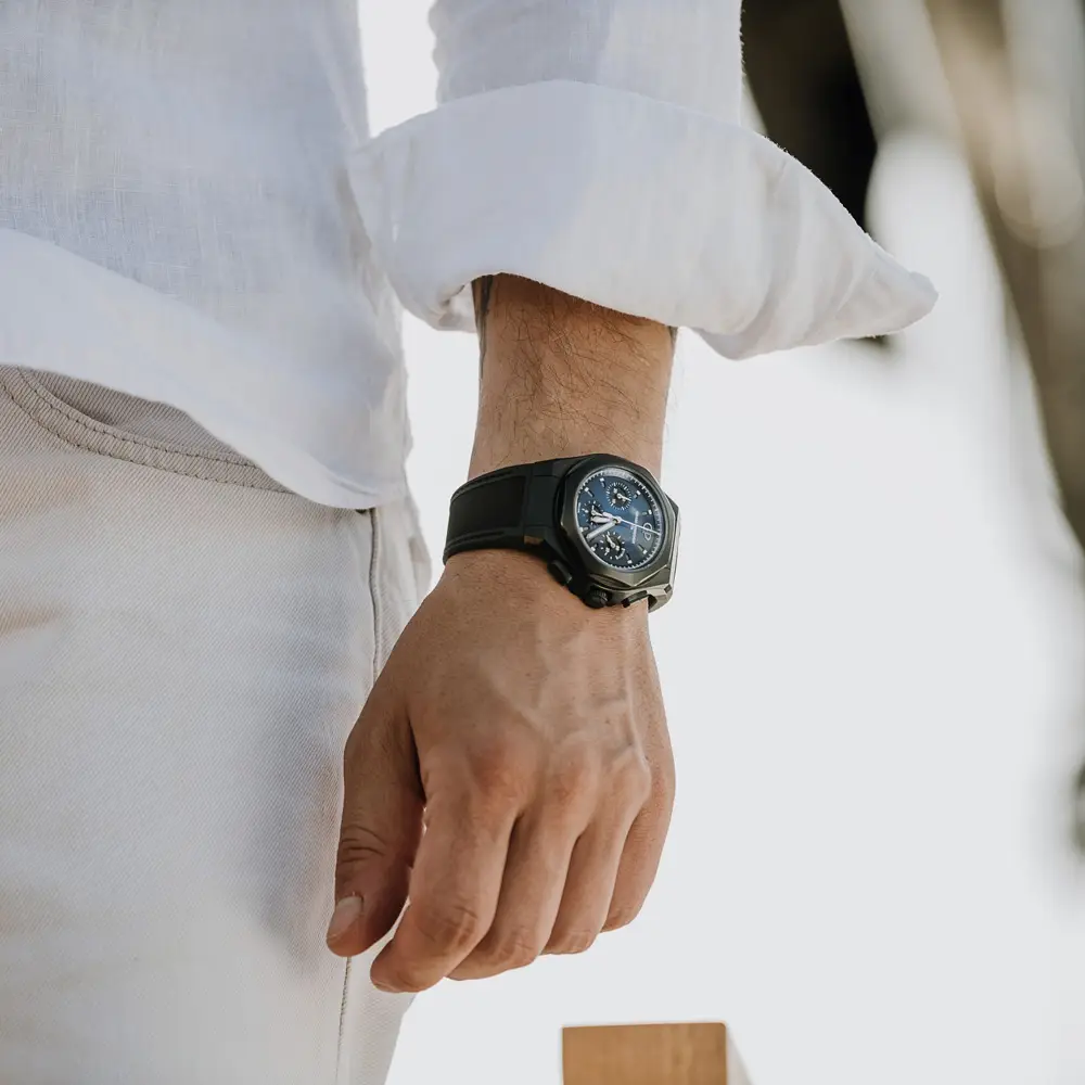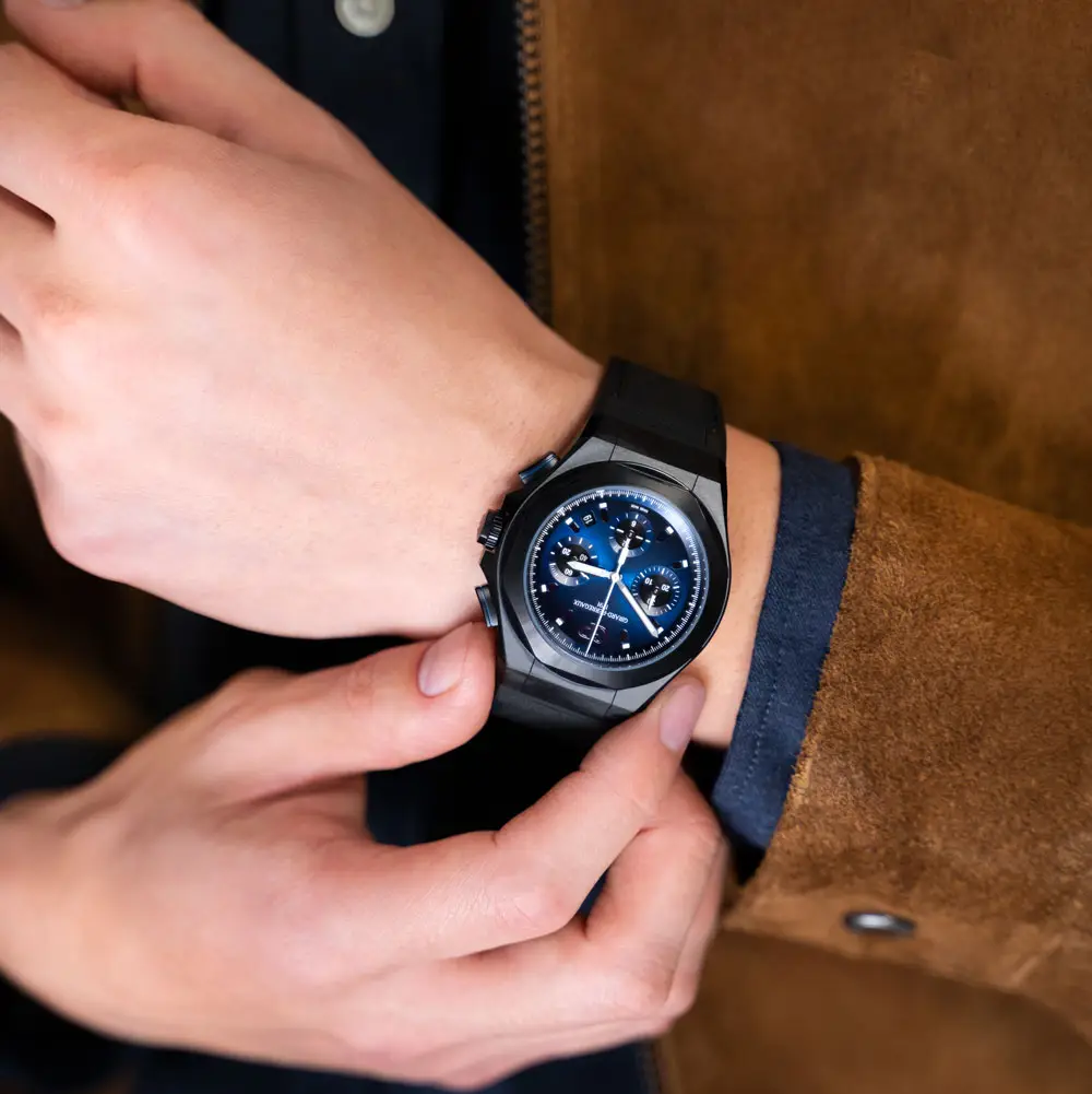 在 蓝宝石水晶玻璃 下,呈现出引人注目的 蓝色模拟表盘,具备 计时功能与实用的日期显示,非常适合活跃生活方式。腕表 防水等级30 ATM(300米),适合严苛环境及专业水下用途。