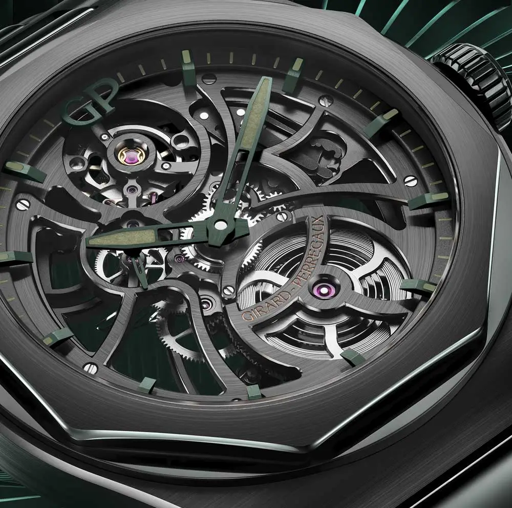 Hodinky zaujmou skeletonizovaným ciferníkem s výhledem na vnitřní mechaniku – manufakturní kalibr GP01800-2627. Tento automatický strojek má rezervu chodu 54 hodin, pracuje na frekvenci 28 800 polokmitů za hodinu a je zakončen elegantním rotorem z růžového zlata, zdobeným motivem Aston Martin. Indexy i ručičky jsou opatřeny zeleným PVD povrchem s luminiscencí v barvě Aston Martin Racing Green, která dodává hodinkám výrazný sportovní nádech.