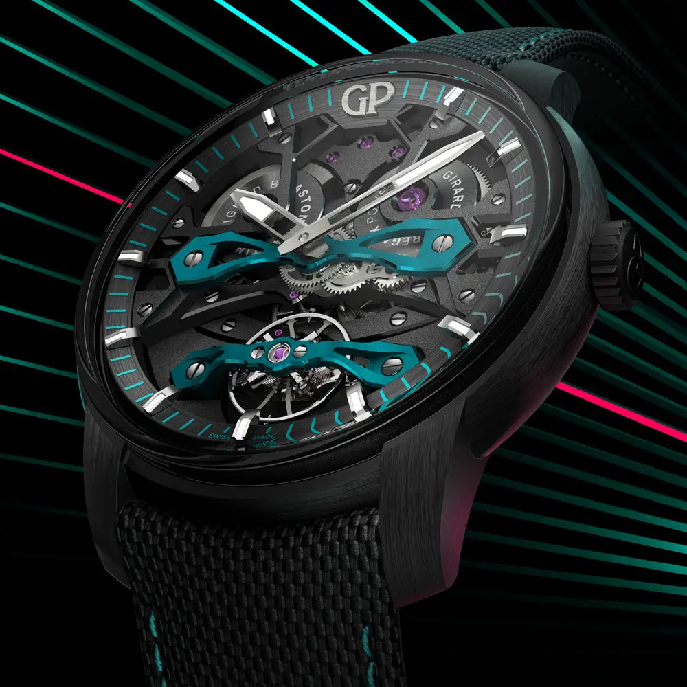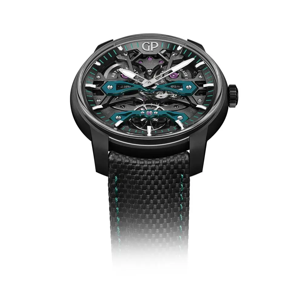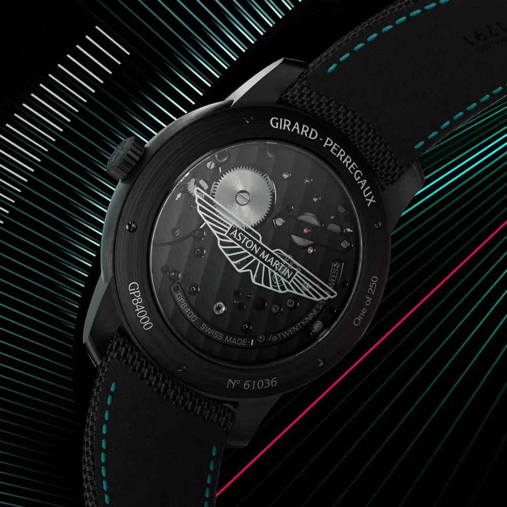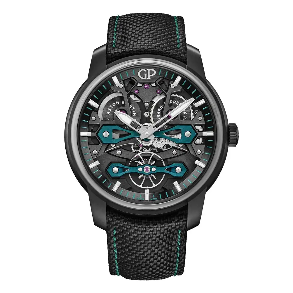 Girard-Perregaux Neo Bridges Aston Martin Edition 腕表是瑞士制表工艺与英国 Aston Martin 汽车优雅融合的独特致敬之作。直径45毫米的圆形表壳采用轻盈钛金属并配以坚固黑色 DLC 涂层,赋予腕表现代而运动的外观。
