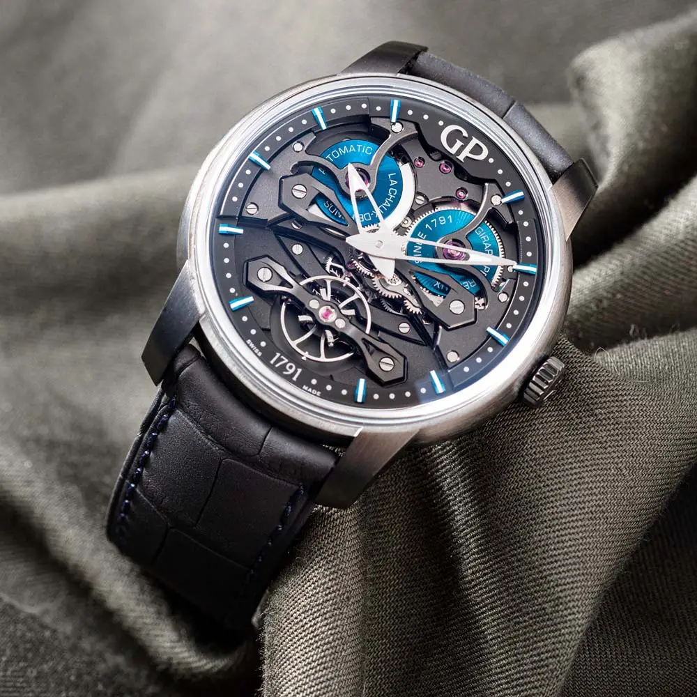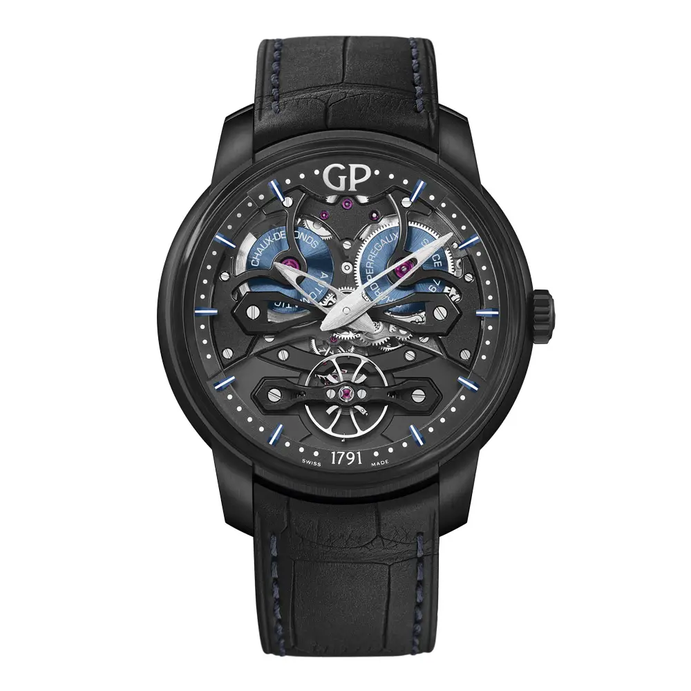 Girard-Perregaux Neo Bridges Earth to Sky Edition 结合了 现代美学与瑞士制表传统。其 45 毫米钛金属表壳搭配黑色 DLC 涂层,展现出未来感设计与蓝色点缀的镂空表盘,象征天地之间的平衡。