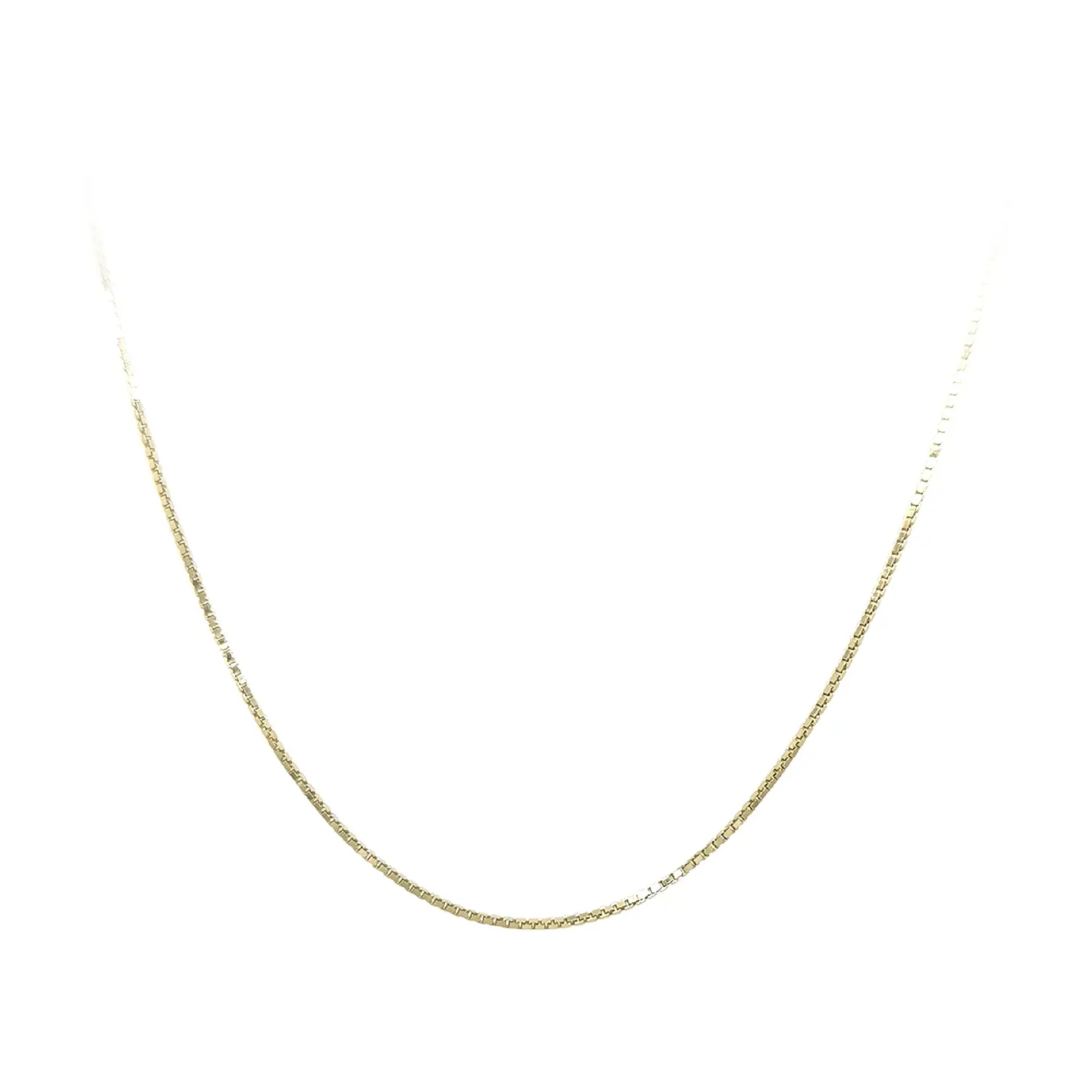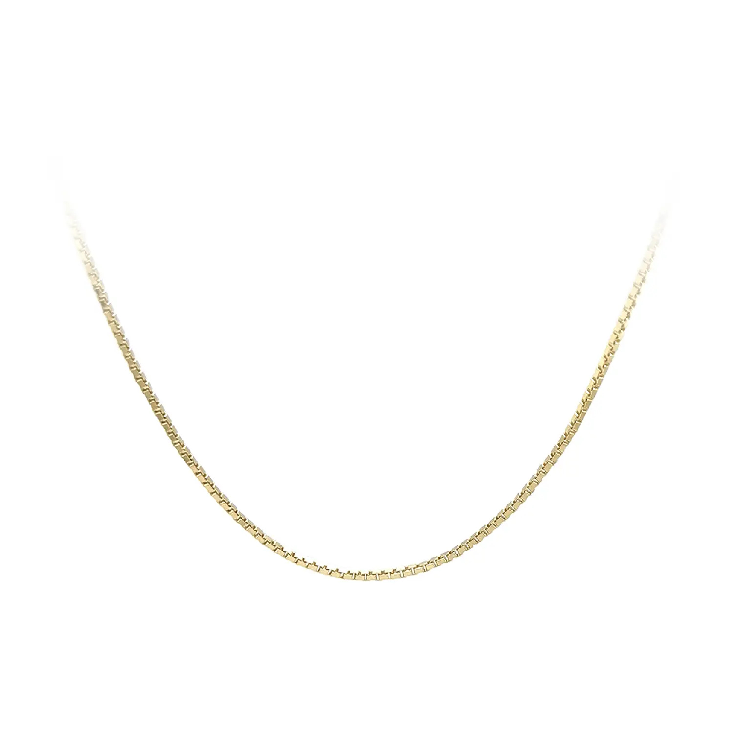 这款黄金 Box(方盒链)以精细的小方形链节结构著称,呈现顺滑而利落的线条,并带有轻盈的几何光泽。其极简设计经典耐看,无论日常佩戴或与其他首饰叠搭都非常合适。0.80 mm 的纤细宽度使其显得格外精致优雅。
