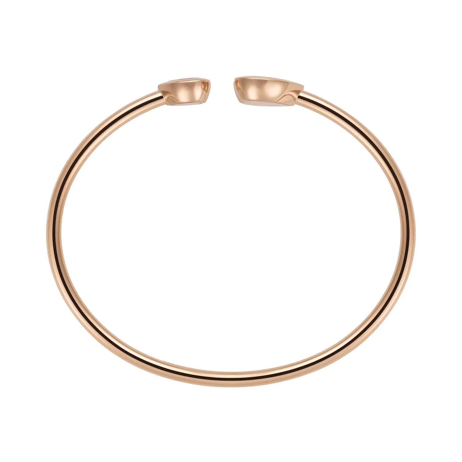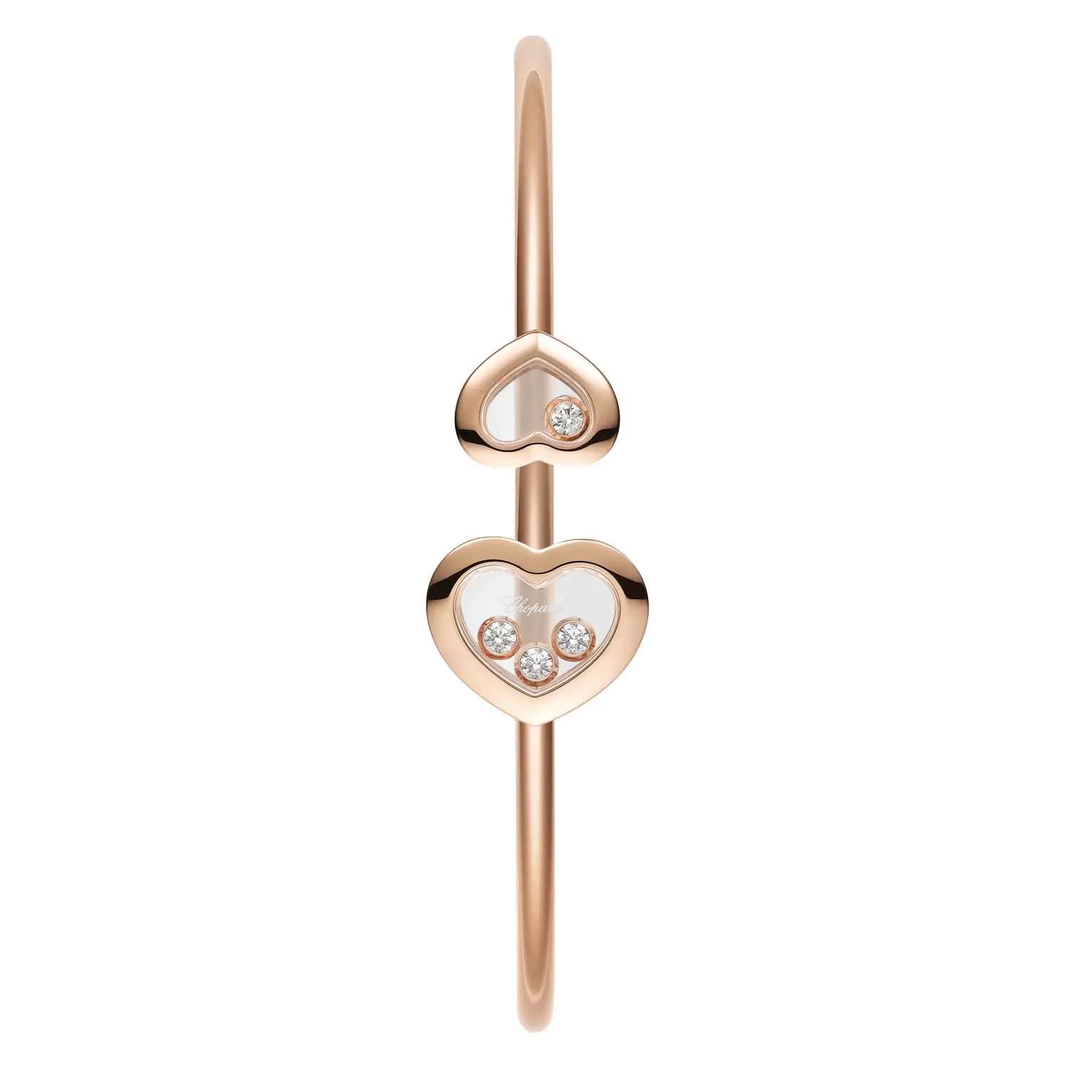 这款来自 Happy Diamonds Icons 系列的手镯,以 18 K 玫瑰金 精制,镶嵌 4 颗总重约 0.20 克拉的自由旋转钻石,每颗钻石都封装在两层蓝宝石水晶之间,在光影中灵动闪耀。它象征着自由、喜悦与女性柔美的气质,是萧邦标志性设计的体现。