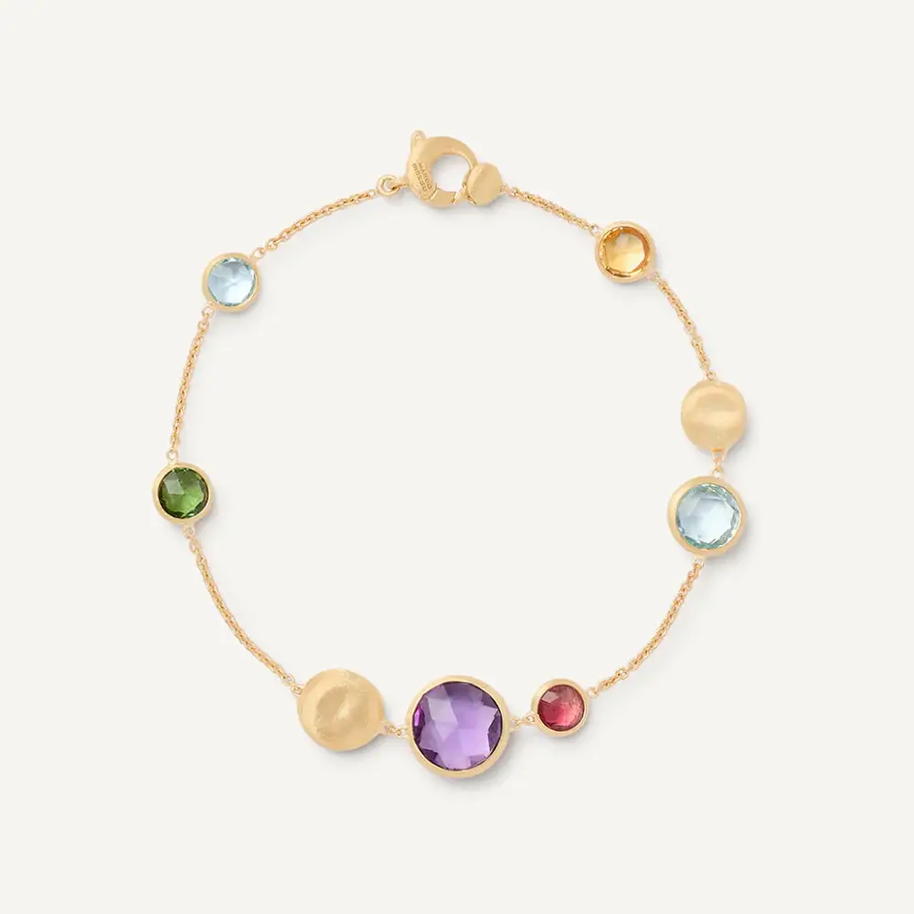 手链镶嵌 6 颗天然多彩宝石,每颗为 圆形切割 (Round) 并采用 玫瑰式切割 (Rose Cut) 工艺。宝石的多色组合与黄金的温暖色调相互辉映,营造出丰富而和谐的光影效果。Jaipur 系列灵感源自印度“宝石之城”,象征文化与工艺的完美结合。