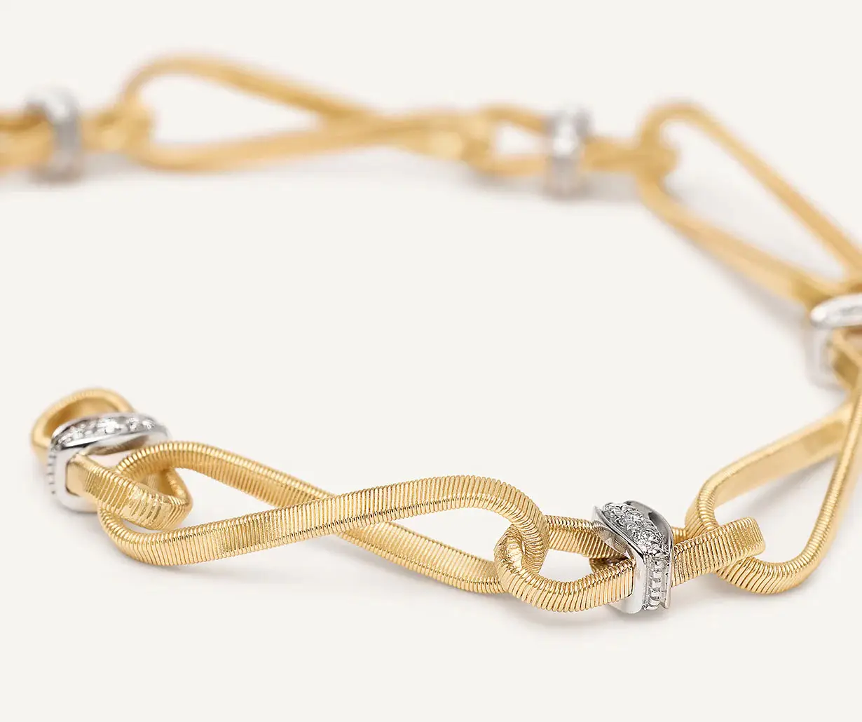 每件作品均由 18K 金 制作,并采用 Marco Bicego 标志性的 手工扭丝工艺 装饰。这一细节赋予珠宝细腻的动感、质感与深度,使其充满生命力与独特性。Marrakech 系列包含 项链、手链、耳环和戒指,常常镶嵌钻石,增添璀璨光芒。