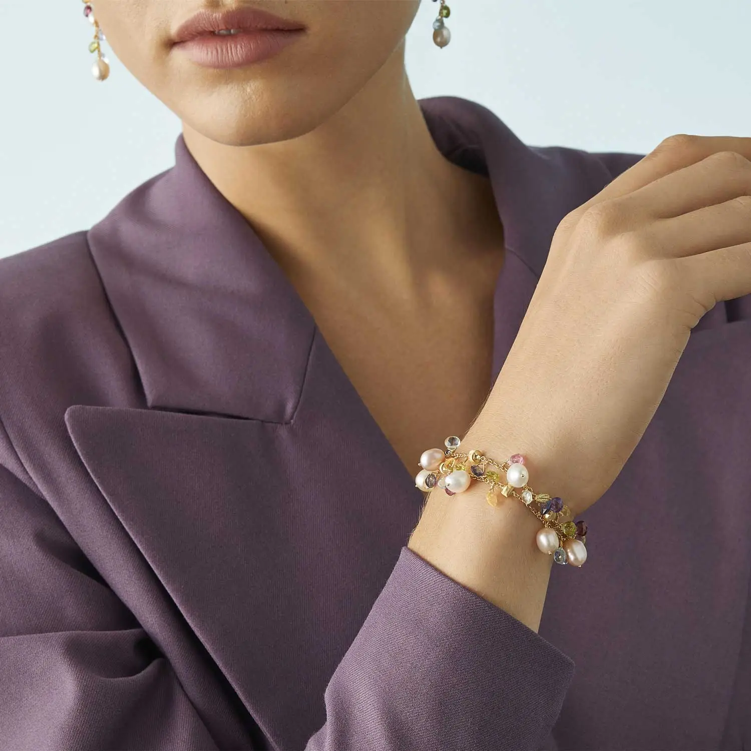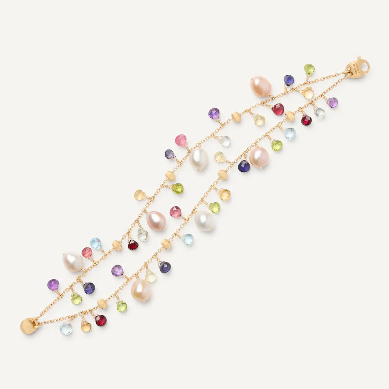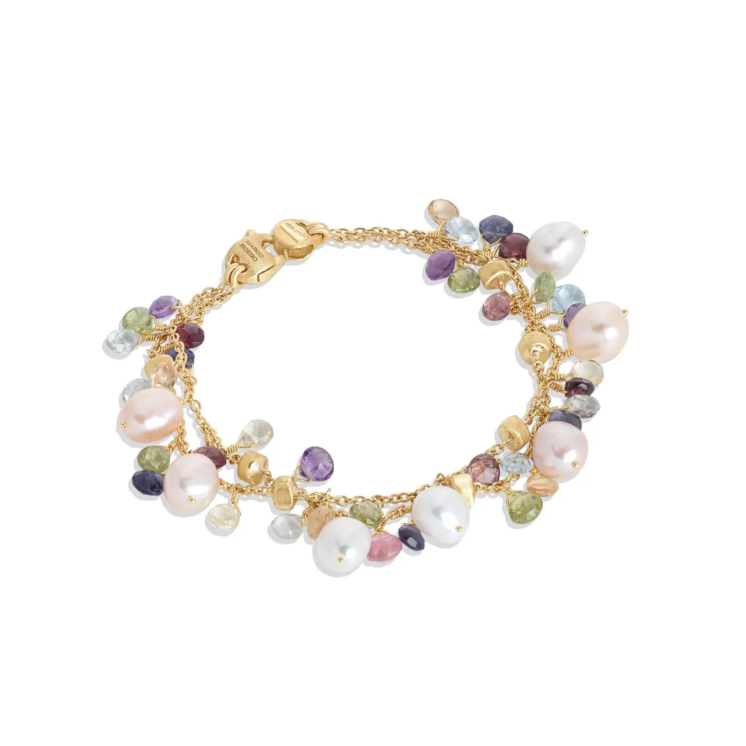 手链采用 双层结构设计,其中 切割天然宝石与珍珠 与 手工雕刻的金珠 交替排列。金珠采用传统 佛罗伦萨 bulino 工艺 制作,呈现细腻的缎面质感,这是 Marco Bicego 珠宝的标志性特点。