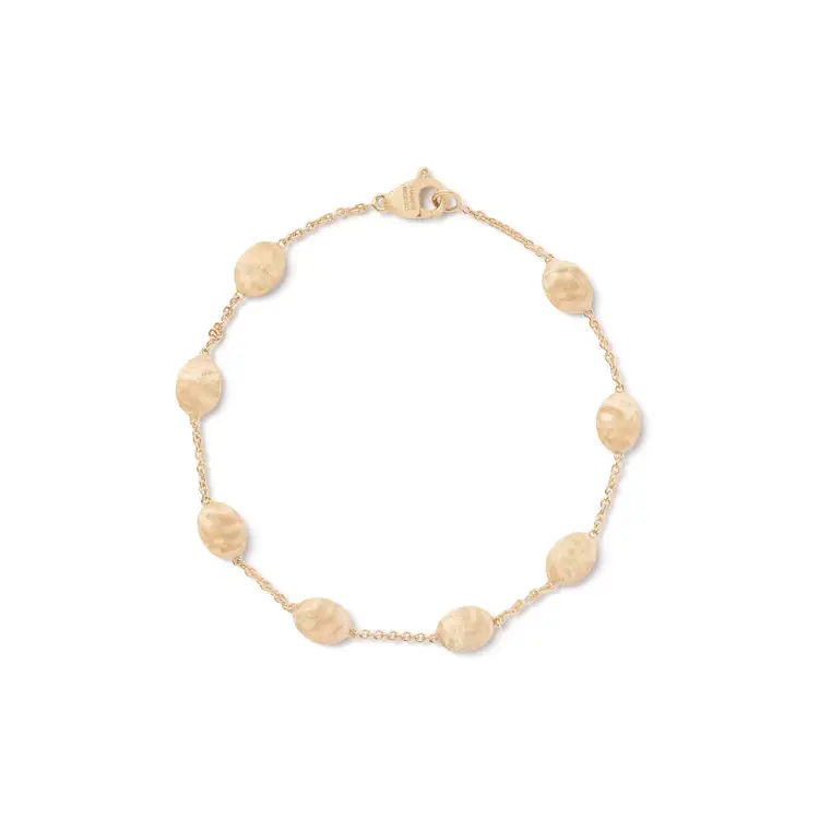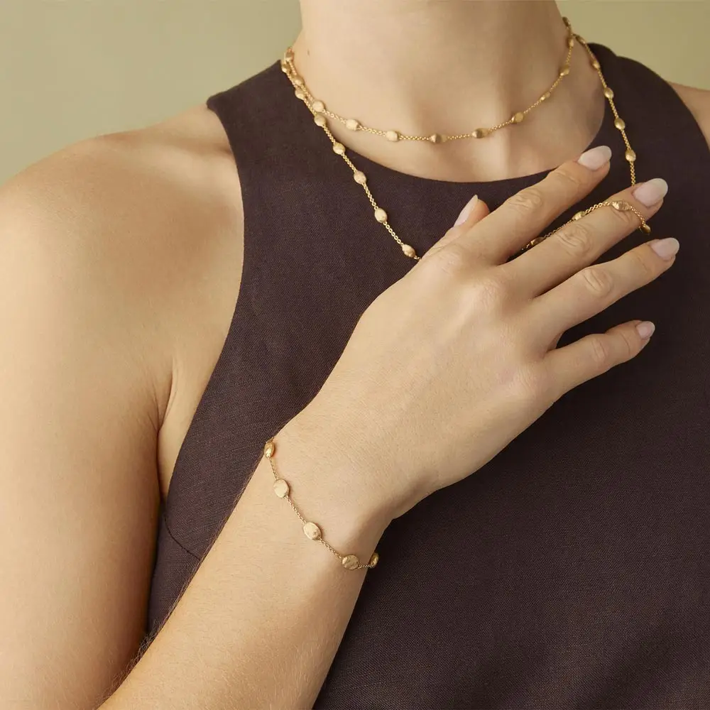 每件作品均由 Marco Bicego 工坊手工打造,并饰以 bulino 手工雕刻,赋予其丝绒般的哑光质感。精致的金片通过轻盈的链条相连,能自然随身体动作摆动。Siviglia 系列包括 项链、手链、耳环和戒指,常点缀钻石以提升精致感。