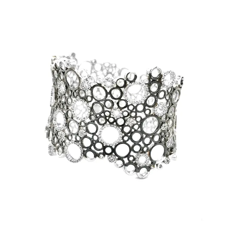 手镯宽度 40.00 mm,线条柔和而坚韧,饰以 346 颗天然圆形切割钻石(总重 3.41 克拉,尺寸 1.20 mm,颜色 G,净度 VS),璀璨夺目。每一颗钻石都精准镶嵌,捕捉光影,折射出迷人光芒。