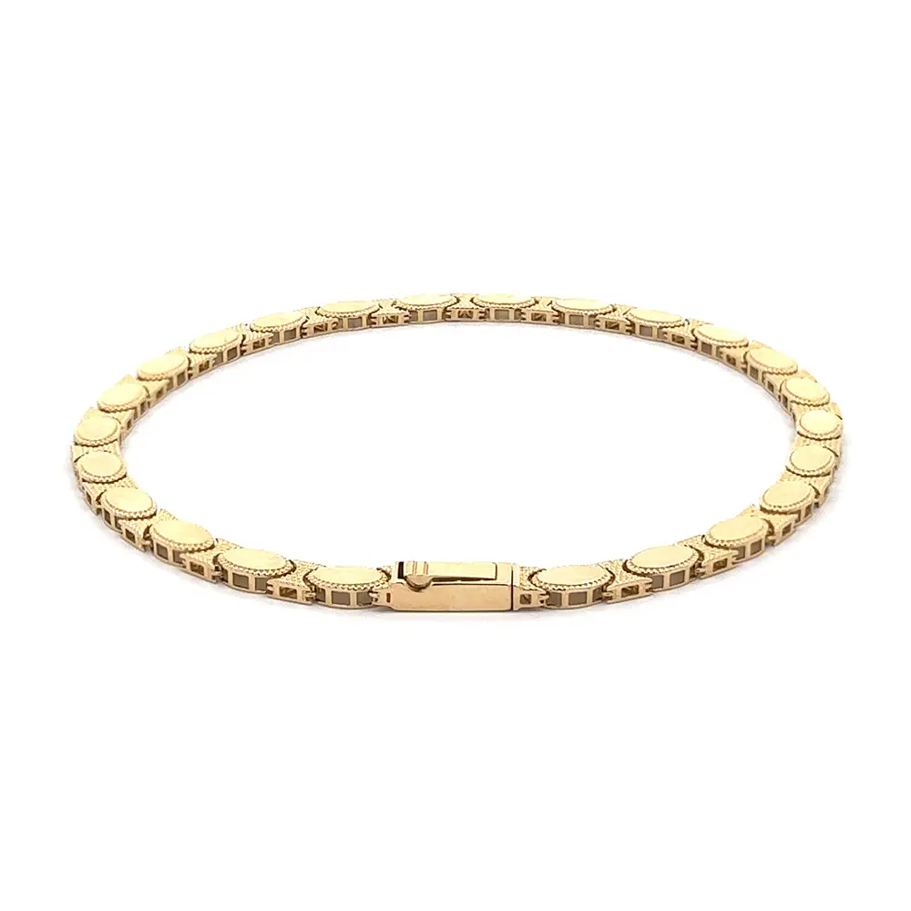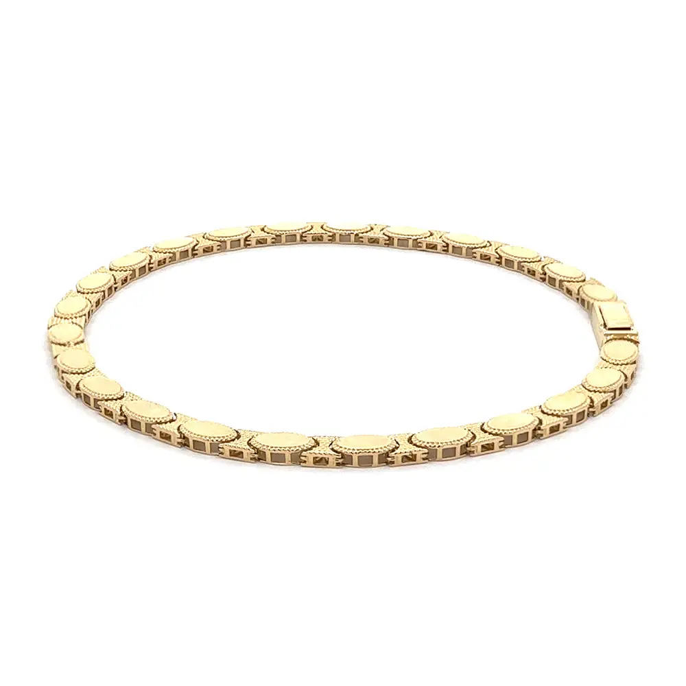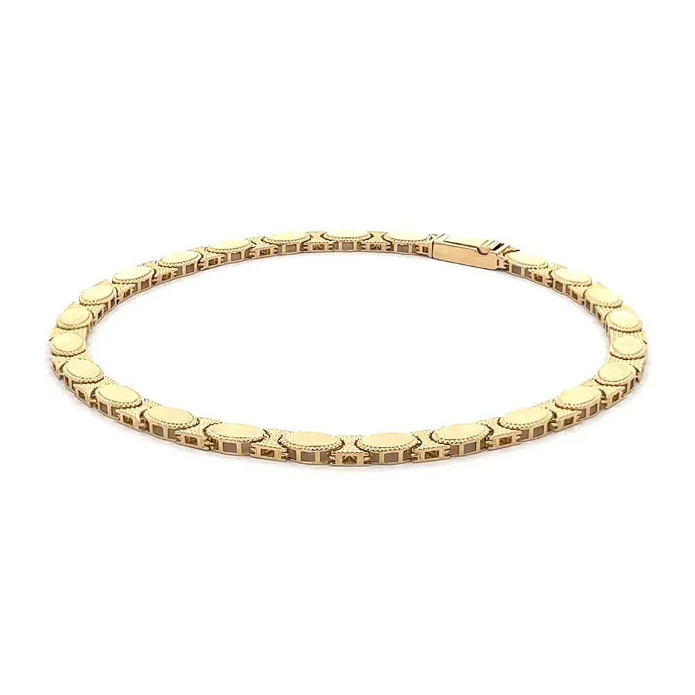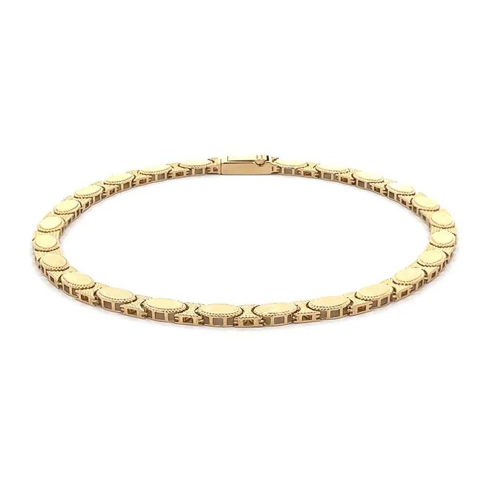 这款 椭圆链节黄金手链 展现了 经典优雅与精湛工艺 的完美结合。每个链节都以椭圆造型精细打造,配以细腻纹理,增添层次与光泽。