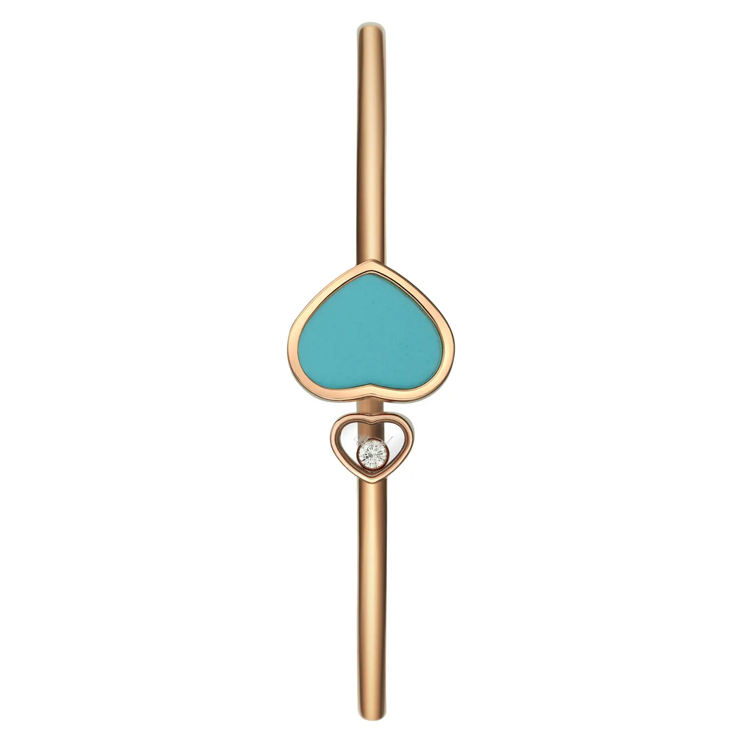 这款来自 Happy Hearts 系列的手镯,融合了 俏皮、女性魅力与喜悦象征。采用 18 K 玫瑰金 精制,饰以 绿松石心形图案 及 约 0.05 克拉的自由旋转钻石,在每次动作中闪耀迷人光彩。绿松石带来活力与积极能量,而简洁的线条展现萧邦的永恒优雅。