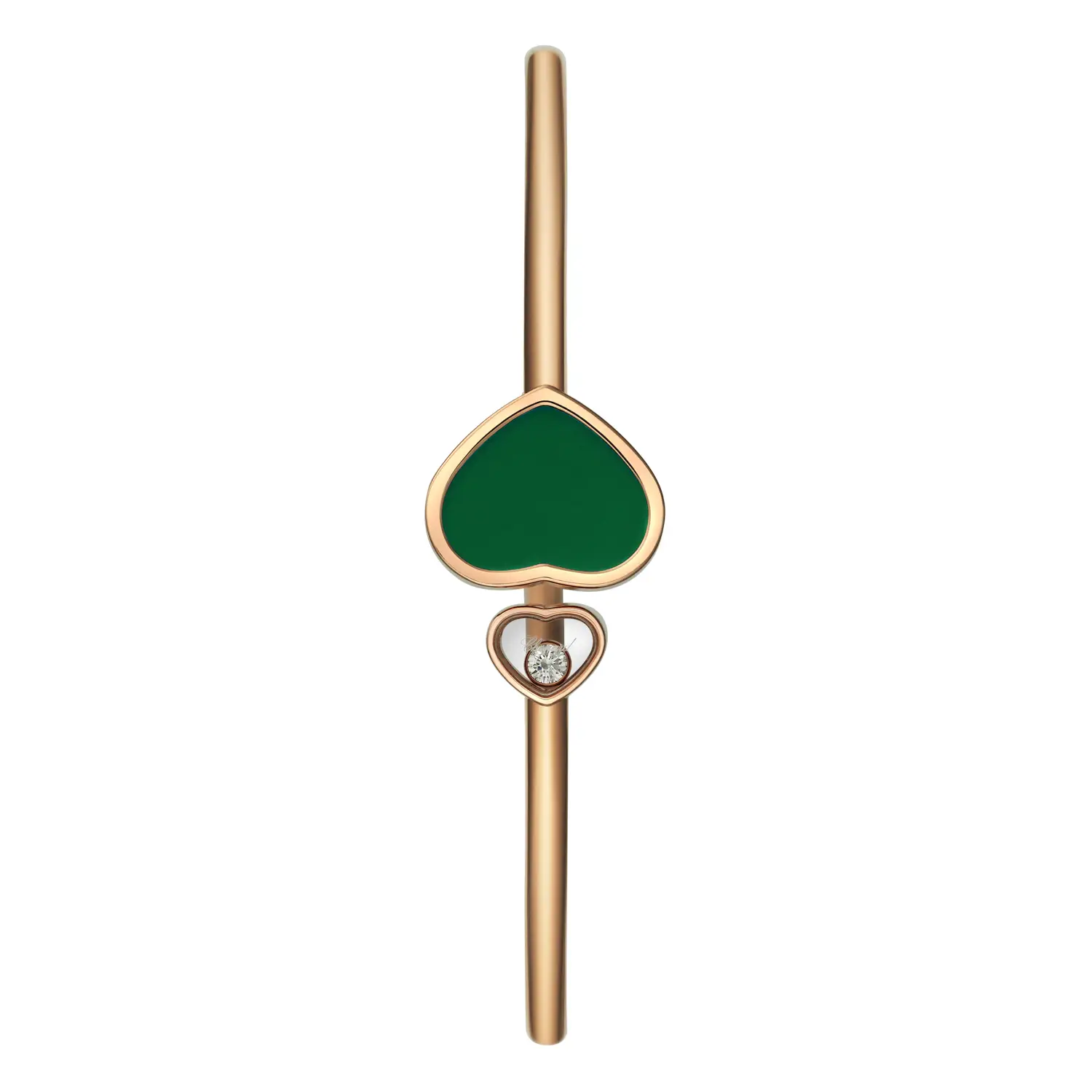 这款来自 Happy Hearts 系列的手镯象征着 爱、喜悦与女性优雅。采用 18 K 玫瑰金 精制,饰以 两个心形图案——一个镶嵌 黑玛瑙,另一个内含 可自由旋转的钻石,展现出动感光影之美。作为萧邦的标志性设计之一,它散发着积极能量与永恒魅力。