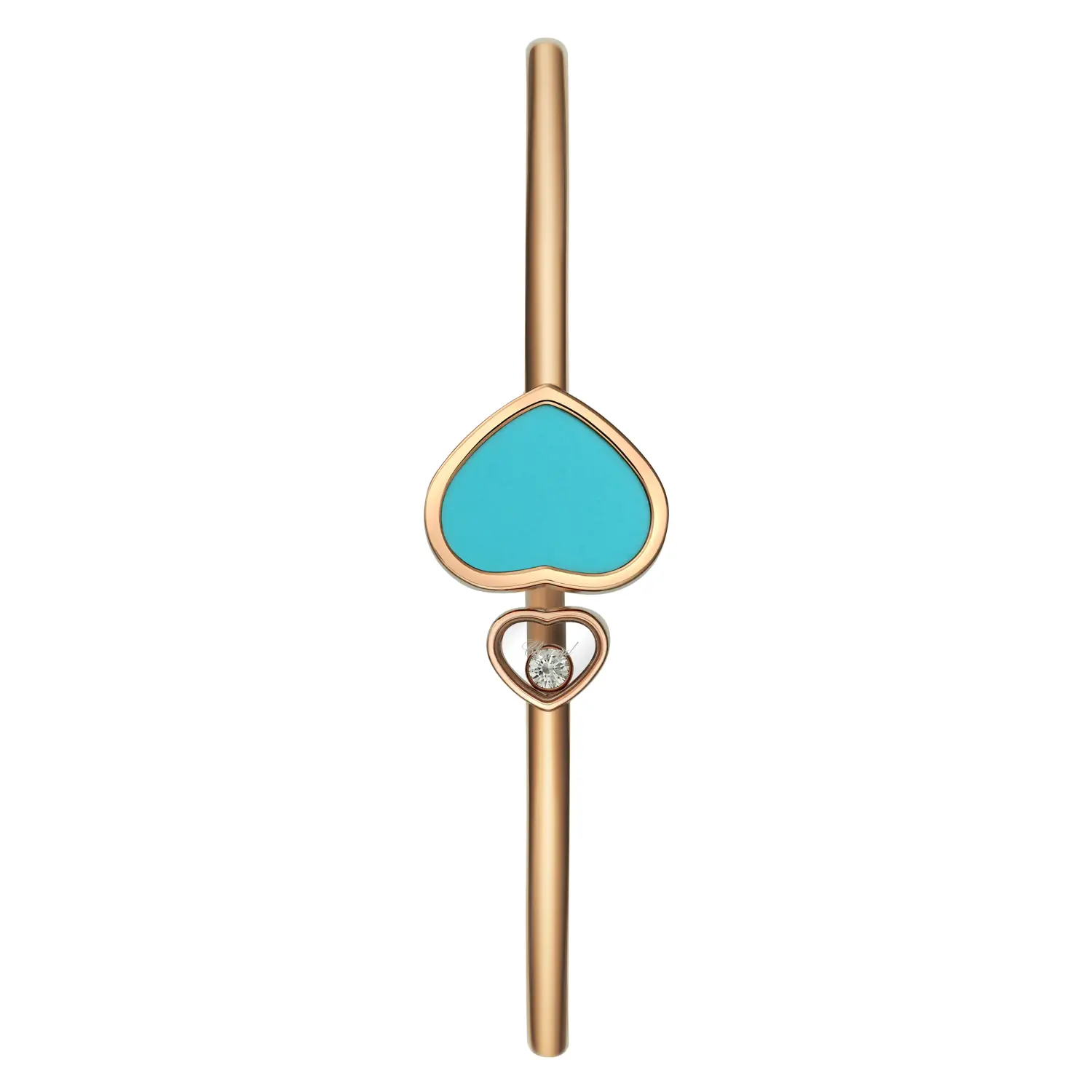 这款来自 Happy Hearts 系列的手镯,展现了 喜悦、女性魅力与萧邦乐观精神。采用 18 K 玫瑰金 精制,饰以 绿松石心形图案 及一颗 约 0.05 克拉的自由旋转钻石,融合了俏皮设计与永恒优雅。明亮的绿松石色调为手镯增添了清新现代的气息。