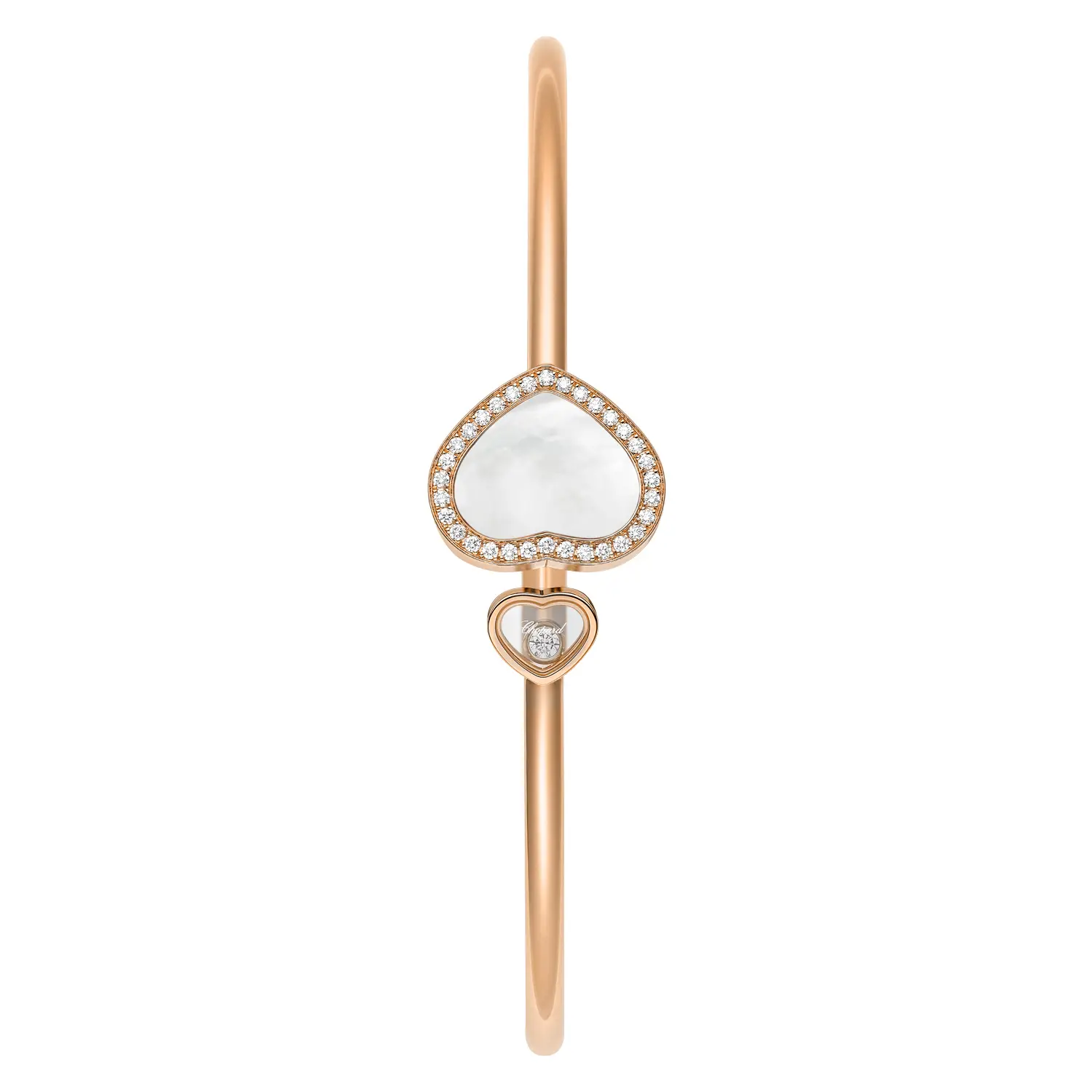 Chopard Happy Hearts 85A074-5303 是一款将标志性图案的俏皮感与永恒优雅完美结合的手镯。由 18K 玫瑰金 (750/1000) 精制而成,散发出温暖的色调,完美衬托女性的柔美与精致。设计的核心是两个心形——一个饰以天然珍珠母,带来丝绸般的光泽,另一个镶嵌着璀璨钻石,点亮每一次目光。