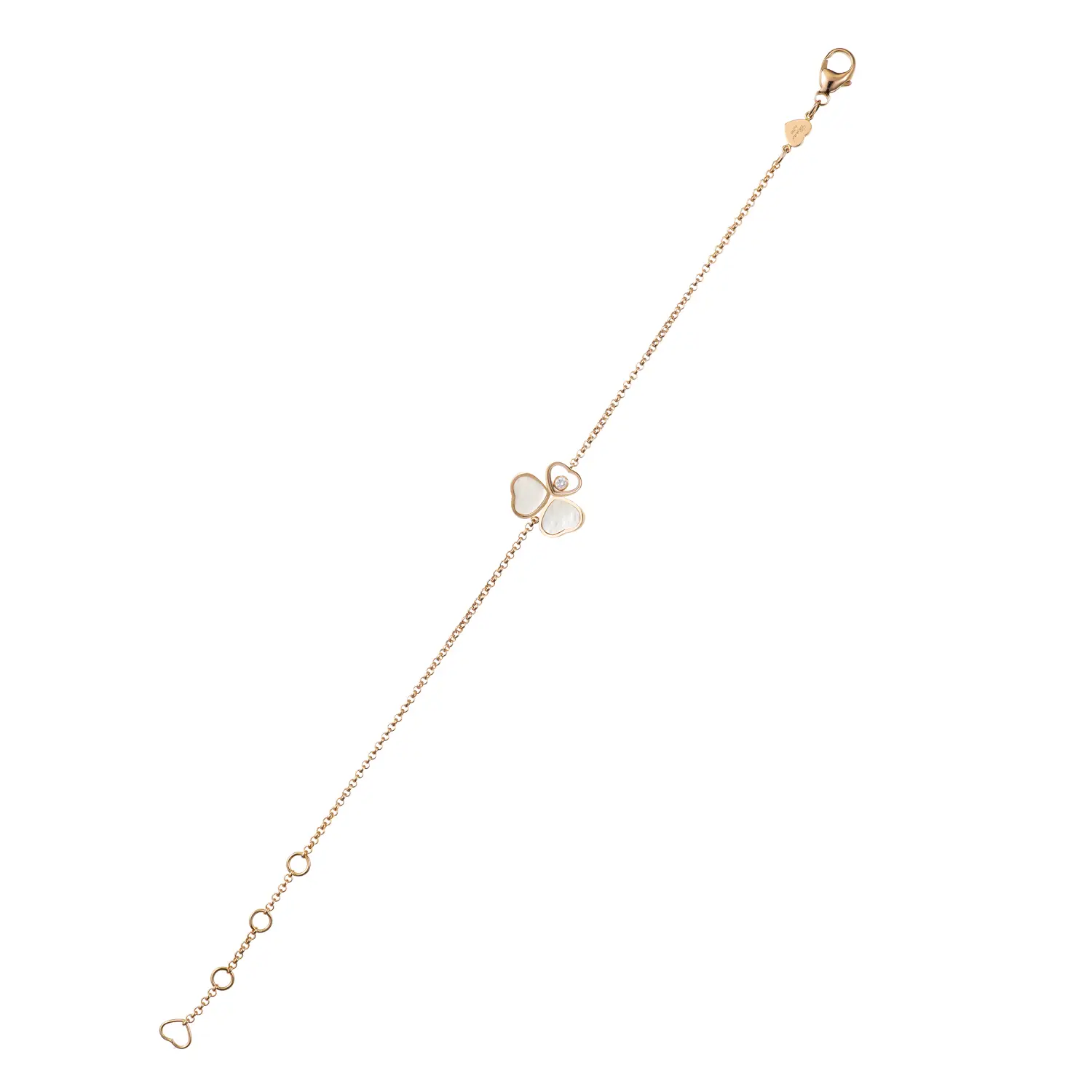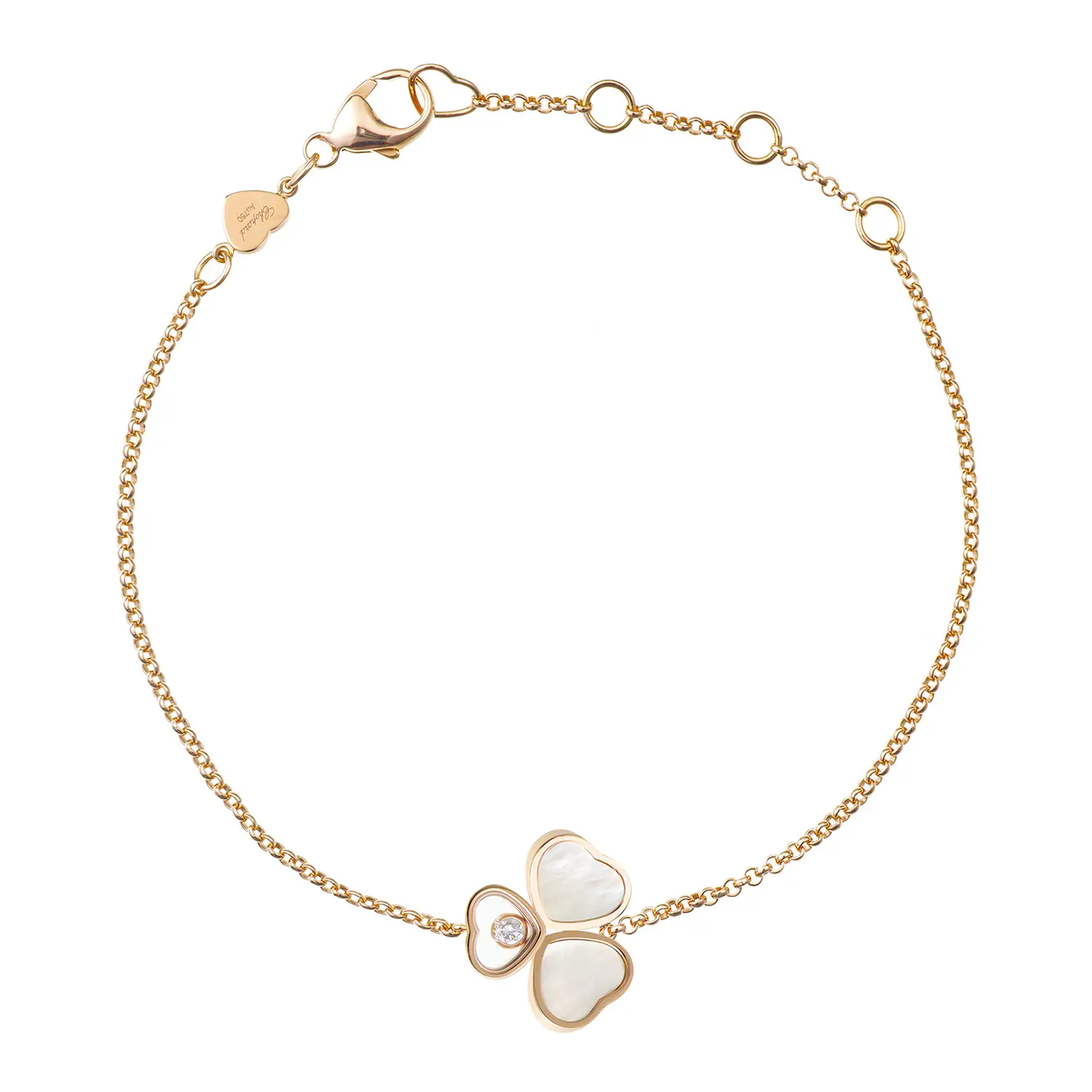 这款来自 Happy Hearts Wings 系列的手镯,象征着 优雅、自由与喜悦。采用 18 K 玫瑰金 精制,饰以 两枚白色珍珠母贝心形图案,组合成蝴蝶的翅膀,并镶嵌一颗 约 0.05 克拉的自由旋转钻石,展现女性的柔美与灵动。