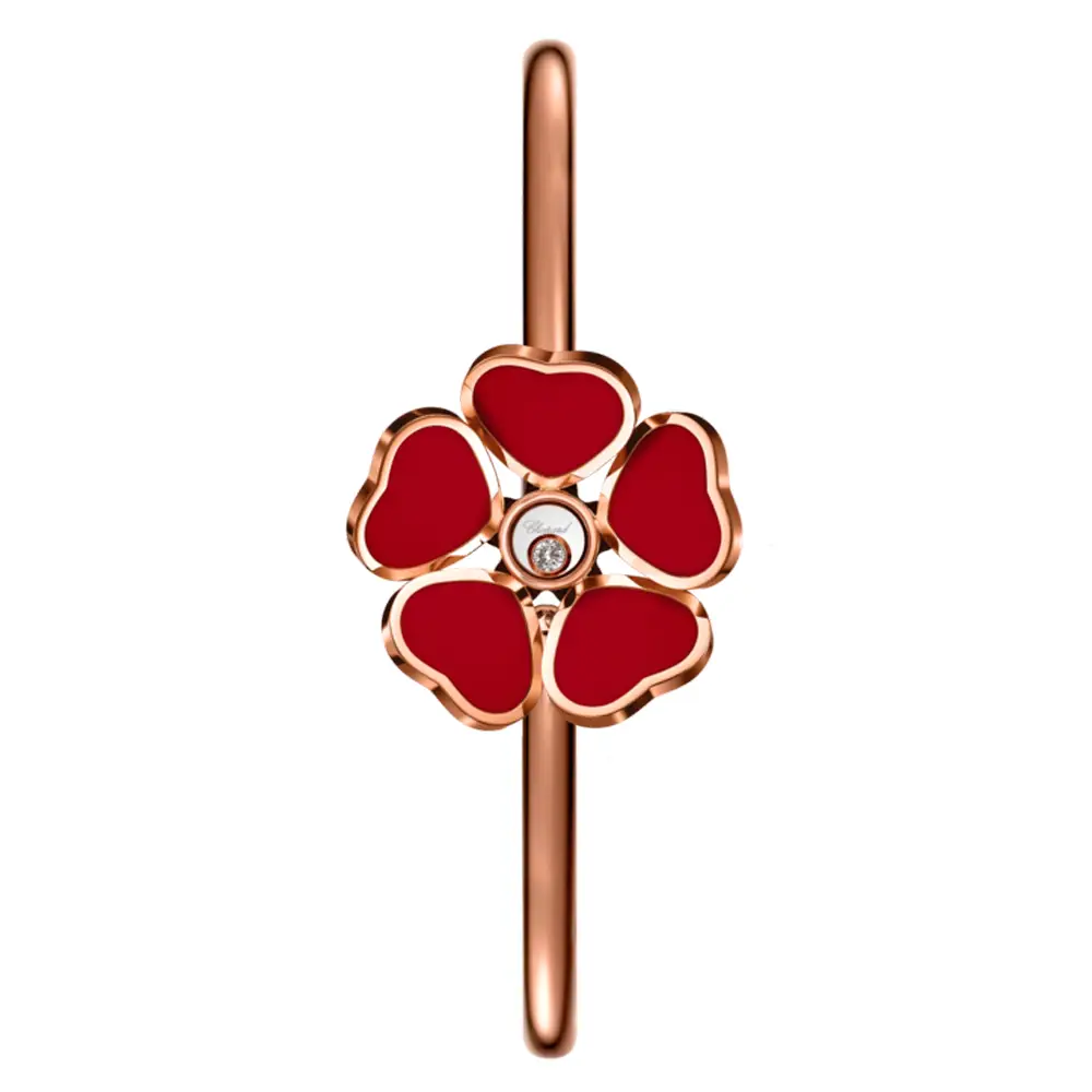 手链采用 18K 玫瑰金 制作,镶嵌 一颗可自由转动的钻石 (0.05 克拉),伴随 红色心形宝石与花朵图案,于举手投足间闪耀光芒。17 厘米长度 佩戴舒适优雅。每一处细节都体现了 Happy Hearts Flowers 系列的精湛工艺与欢悦气息。