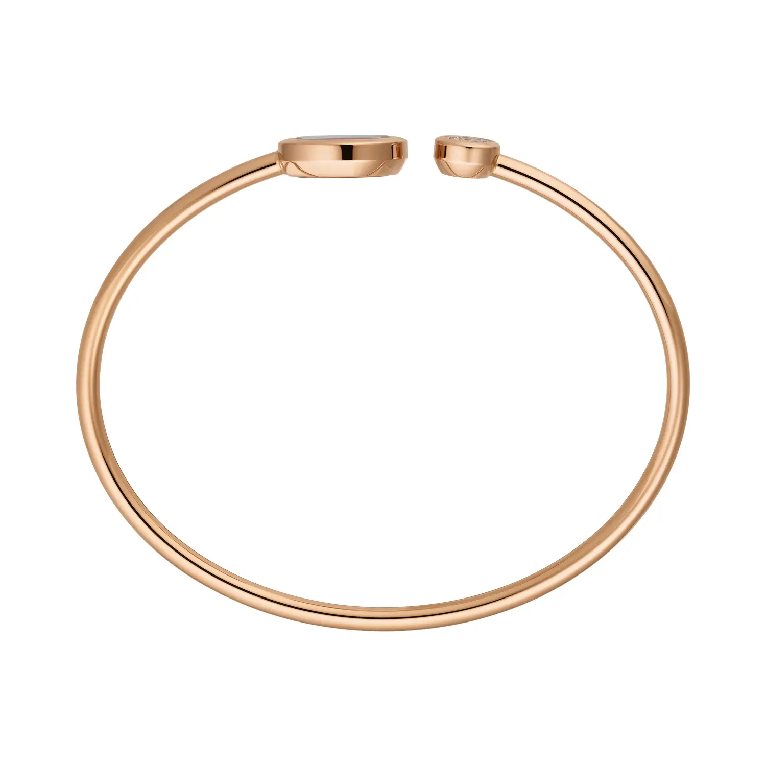 这款来自 Happy Spirit 系列的手镯,以 光影、律动与和谐 为设计灵感。采用 18 K 白金与玫瑰金 双色金材质精制,镶嵌 一颗自由旋转钻石,置于两层蓝宝石水晶之间,随动作闪耀灵动光芒。圆形同心结构象征 统一、平衡与宁静,展现萧邦的设计哲学。