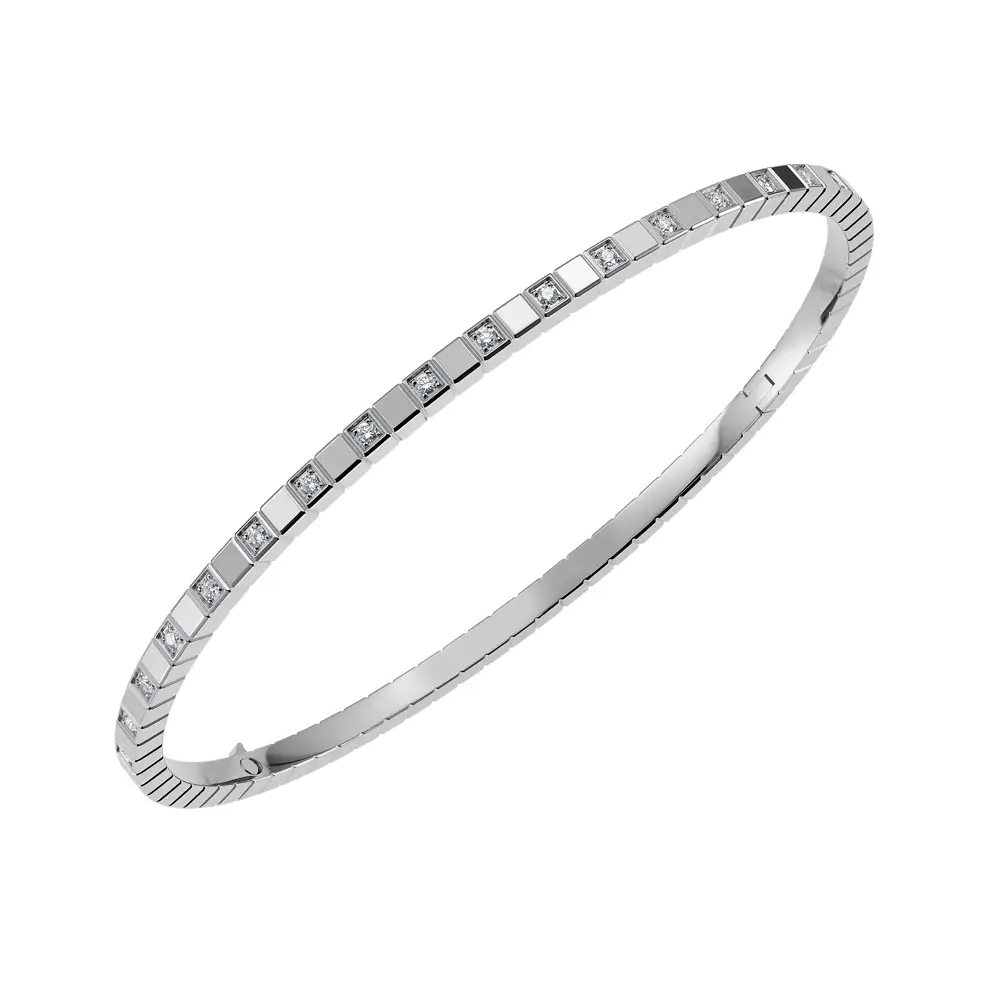 Chopard Ice Cube 857702-1010 黄金手镯代表着 现代优雅,灵感源自冰块的纯净线条。这款奢华珠宝由 18K 白金(750/1000) 精制而成,表面高光抛光,展现出 精致而闪耀的外观。手镯 长度为17厘米,属于 硬式手镯(bangle) 类型,是 适合日常佩戴或正式场合 的标志性配饰。