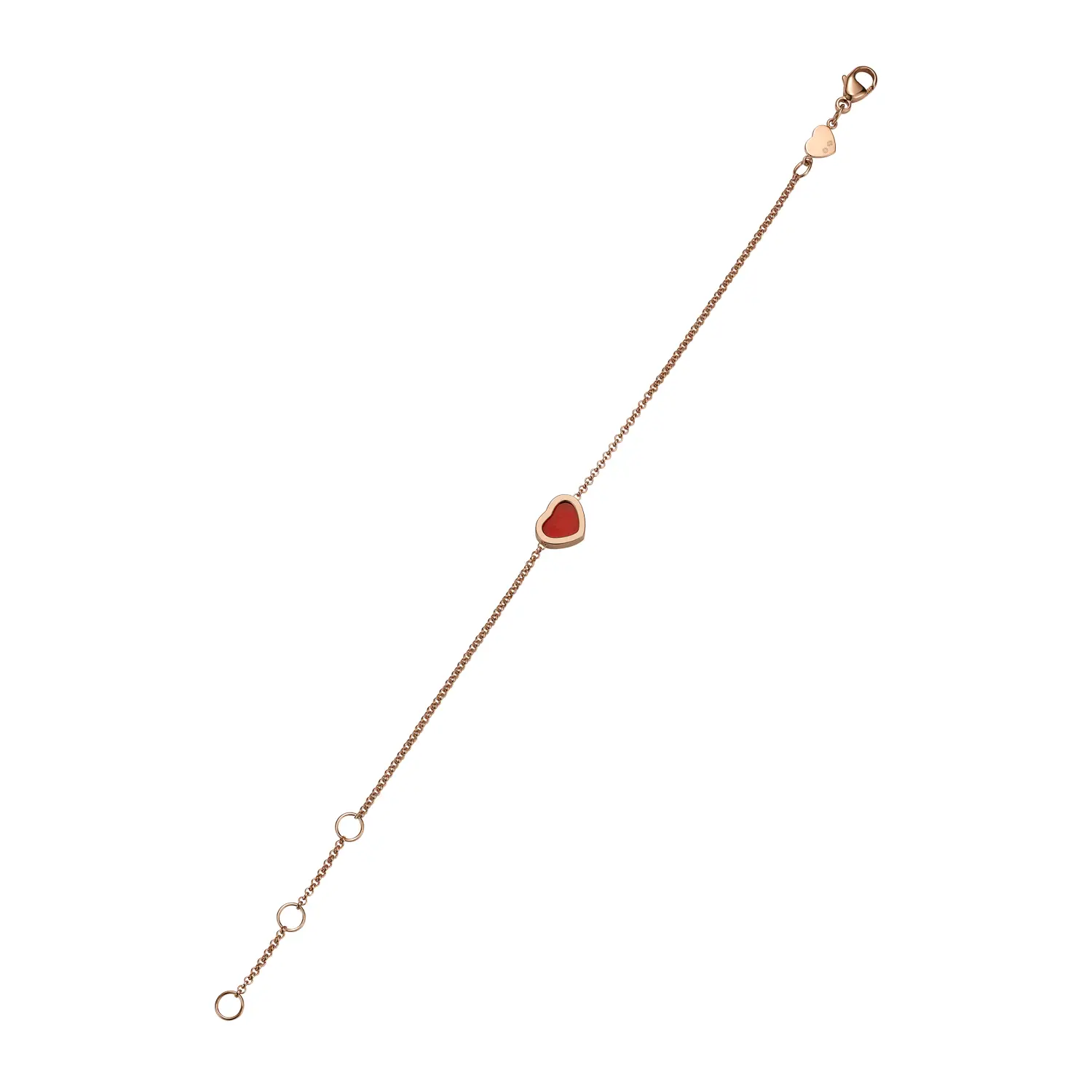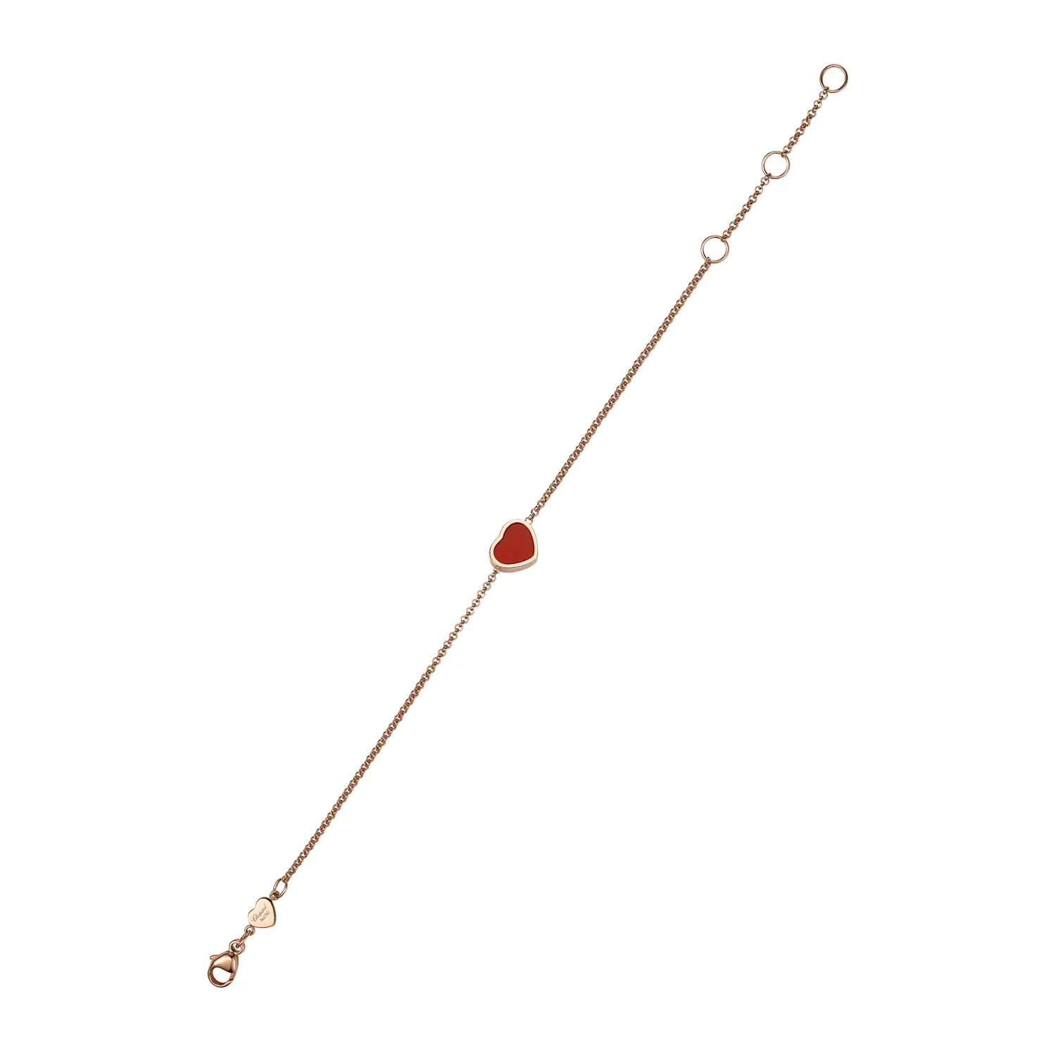 这款来自 My Happy Hearts 系列的手镯,展现 现代女性的优雅与柔美。采用 18 K 玫瑰金 精制,饰以 红玉髓心形图案,以极简设计和温暖色调传递积极能量。每个细节都体现了萧邦的理念:让珠宝成为情感与美的表达。
