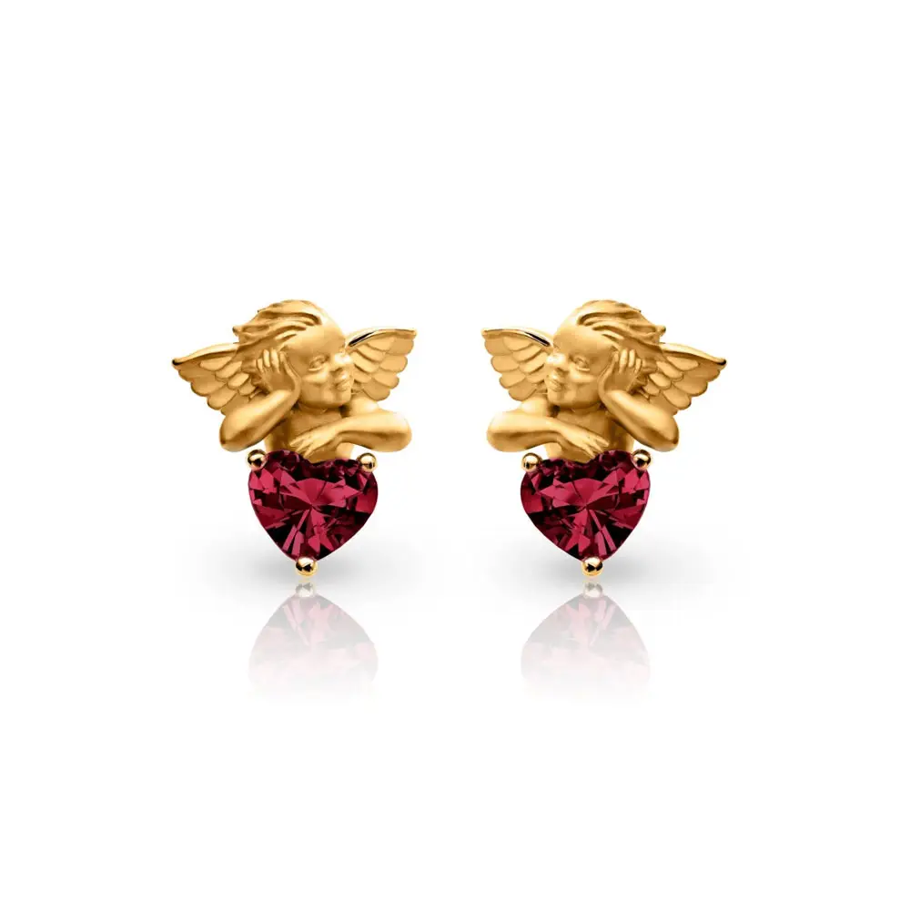 主石选用 2 颗天然红色石榴石 (garnet),以 Heart(心形) 切割形式镶嵌,为珠宝注入温暖与感性象征。每颗石榴石与金属背景形成鲜明对比,凸显 My Angel 系列设计主题。